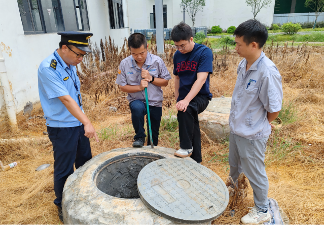 执法人员在工作中除了查看台账资料、巡查生产线外,还对厂区内的污水井、雨水井进行“解剖式”排查。他们不畏刺鼻气味与湿热蒸汽,细致探查井下水流状态、管道接口与井壁水痕,不放过任何雨污混流的蛛丝马迹,以这种最直接、最原始却也最有效的方式,摸清污水“来龙去脉”,核查管网运行状况、污水来源、水质表象,为精准溯源和有效治理提供第一手资料。