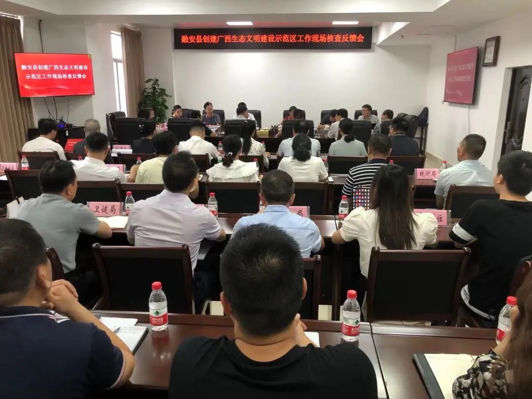 7月18日上午,通过召开核查反馈会的方式,查阅了相关材料,并就申报条件或指标材料存在的问题进行审核或问询;听取了关于融安县创建工作情况汇报,并逐一反馈各自负责审核项目的简要情况。核查组认为,融安县牢固树立“绿水青山就是金山银山”的理念,在广西生态文明建设示范区创建工作推进中成效显著,希望融安县继续加大生态文明建设示范区创建力度,细化落实各项工作,共同营造全民参与生态环境保护的良好社会氛围,为建设人与自然和谐共生的美丽广西贡献更多智慧和力量。