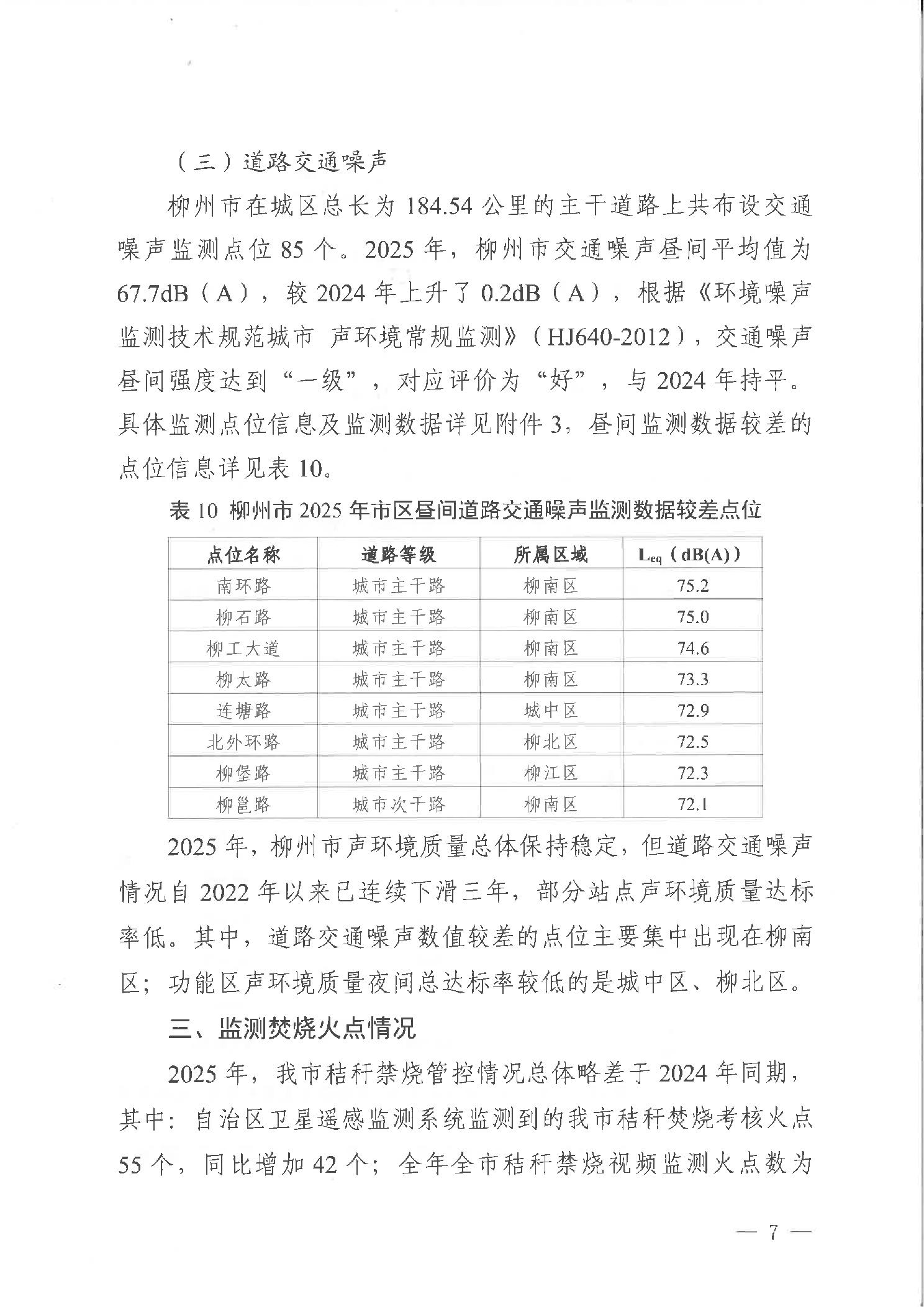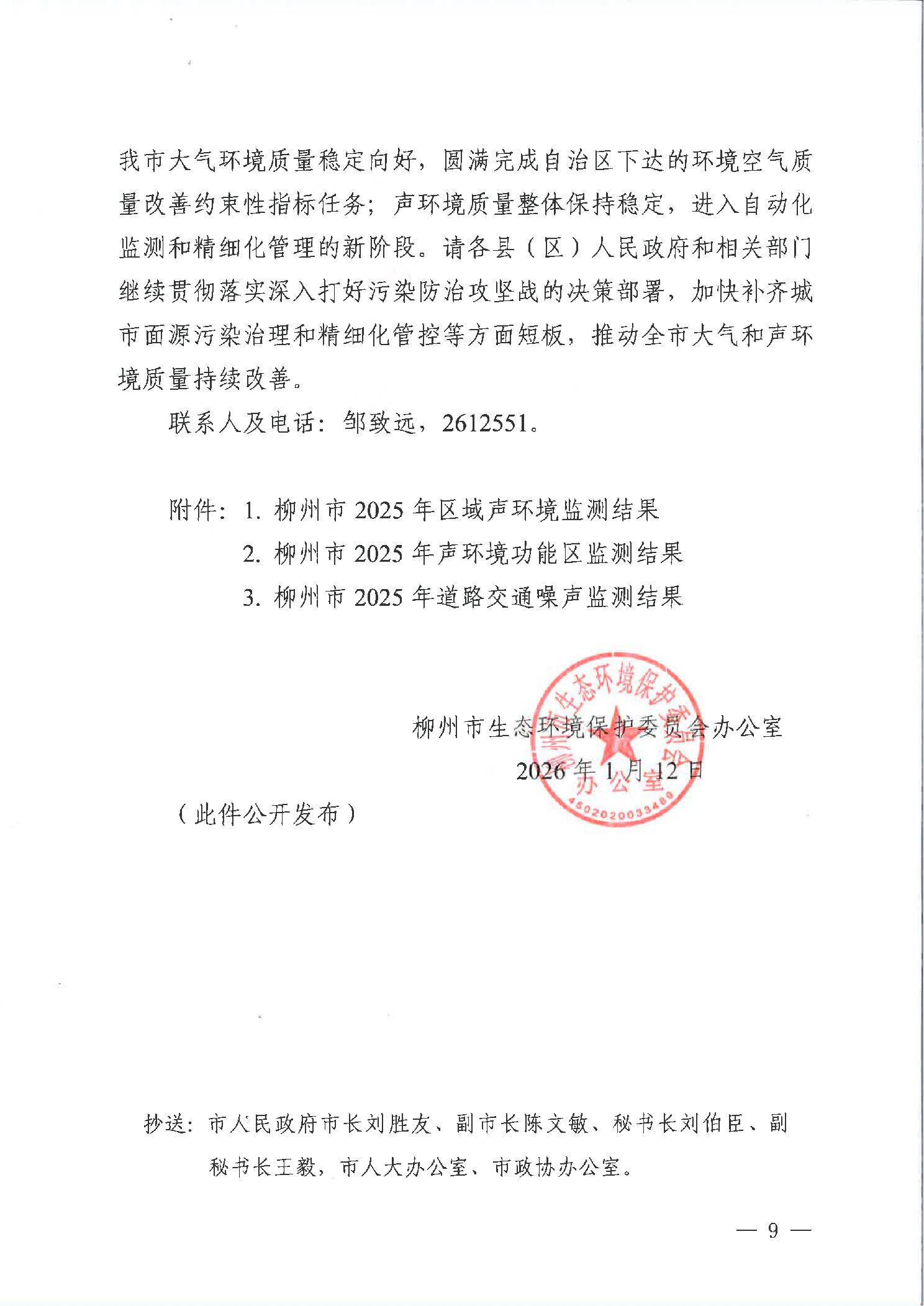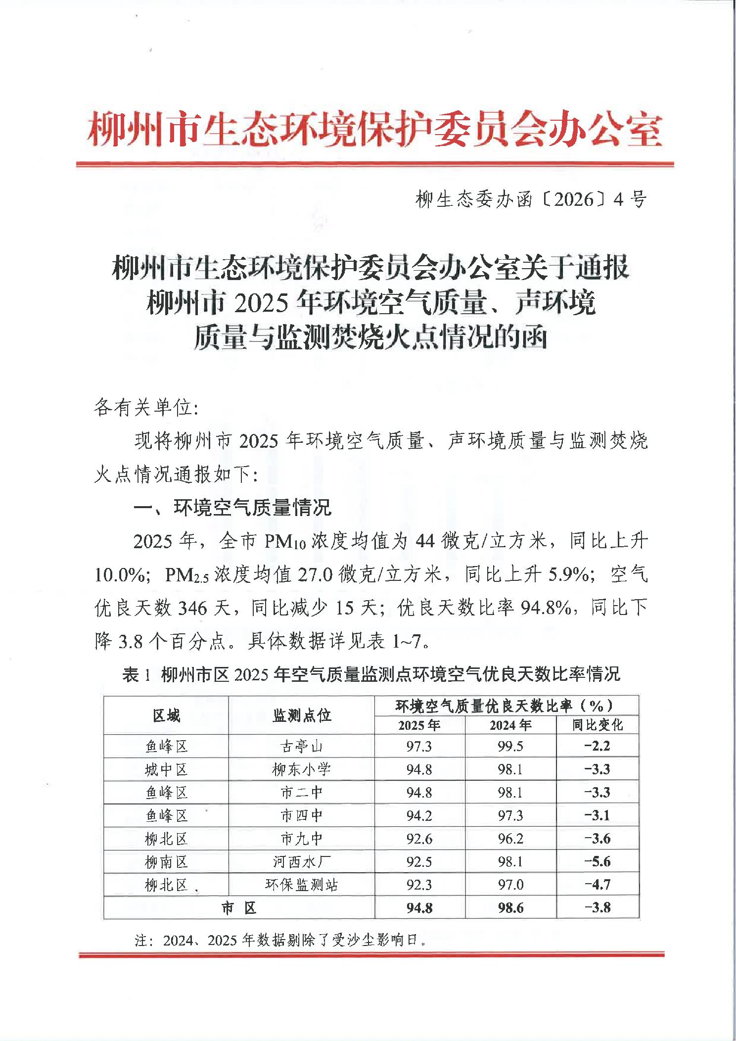 柳生态委办函〔2026〕4号柳州市生态环境保护委员会办公室关于通报柳州市2025年环境空气质量、声环境质量与监测焚烧火点情况的函
