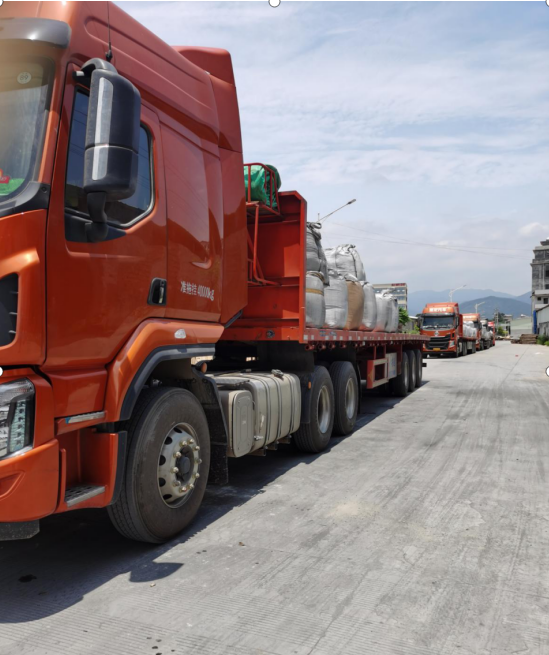 仓库外路边停靠的大货车上装有大量袋装铝灰