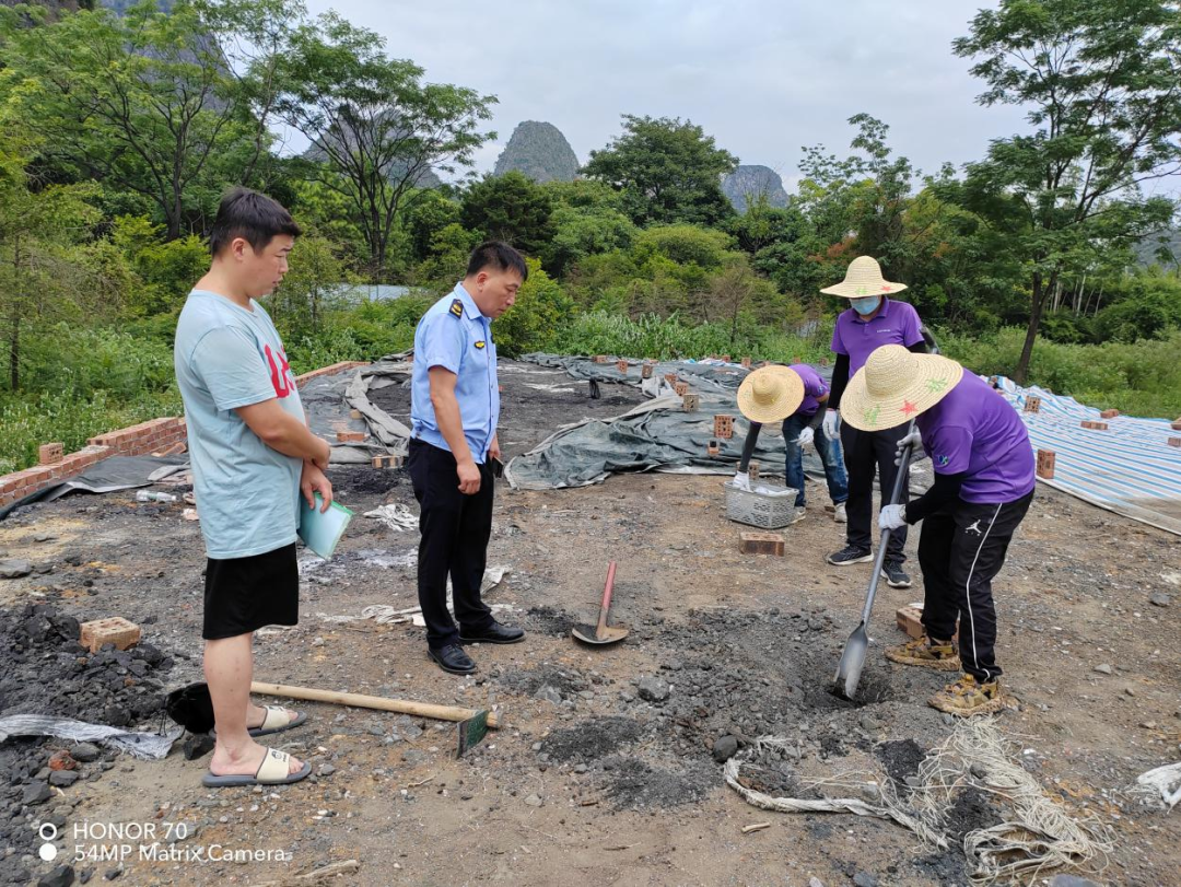 2022年4月,贺州市平桂生态环境局接到群众举报,反映某驾校训练场内堆放的黑色物体散发出刺激气味。执法人员立即赴现场进行核实,发现平桂区黄田镇某驾校训练场内堆放有几十个编织袋装铝灰(渣),伴有强烈的刺激性气味。执法人员通过摸排、走访周边群众等方式,锁定嫌疑人钟某某、吴某某、黄某某。