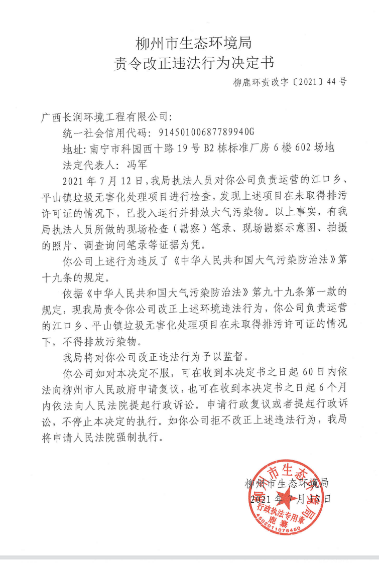 柳州市生态环境局责令改正违法行为决定书(柳鹿环责改字〔2021〕44号) 广西长润环境工程有限公司