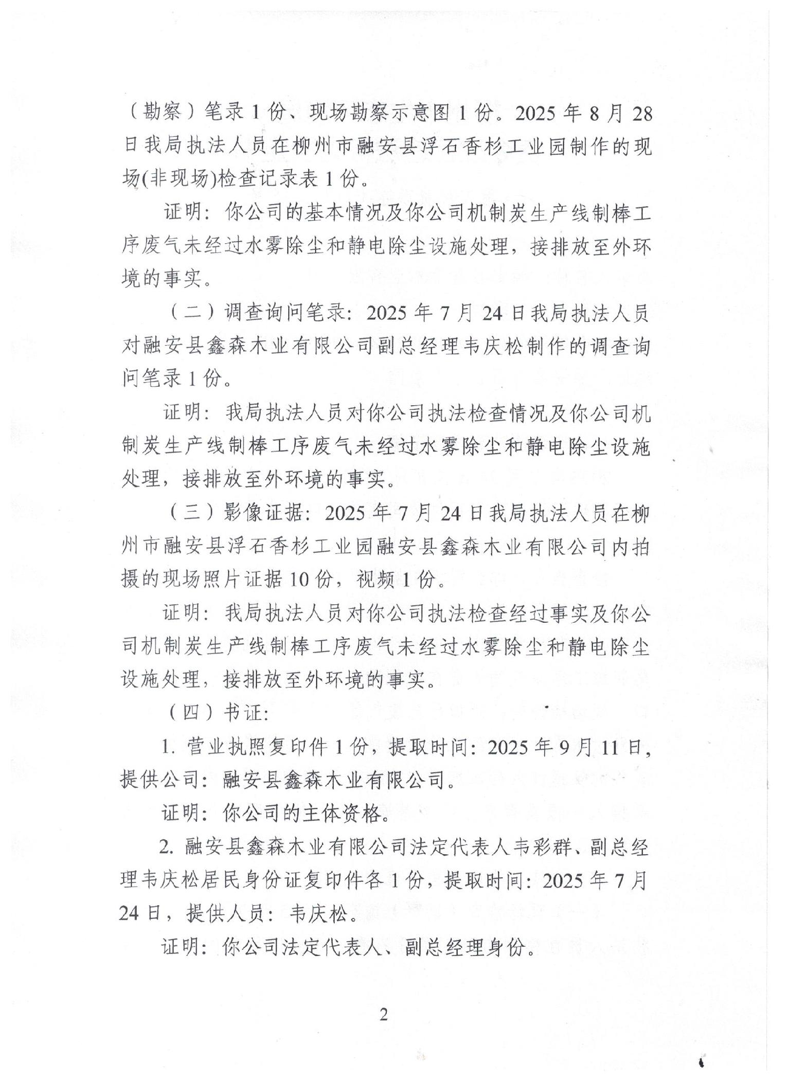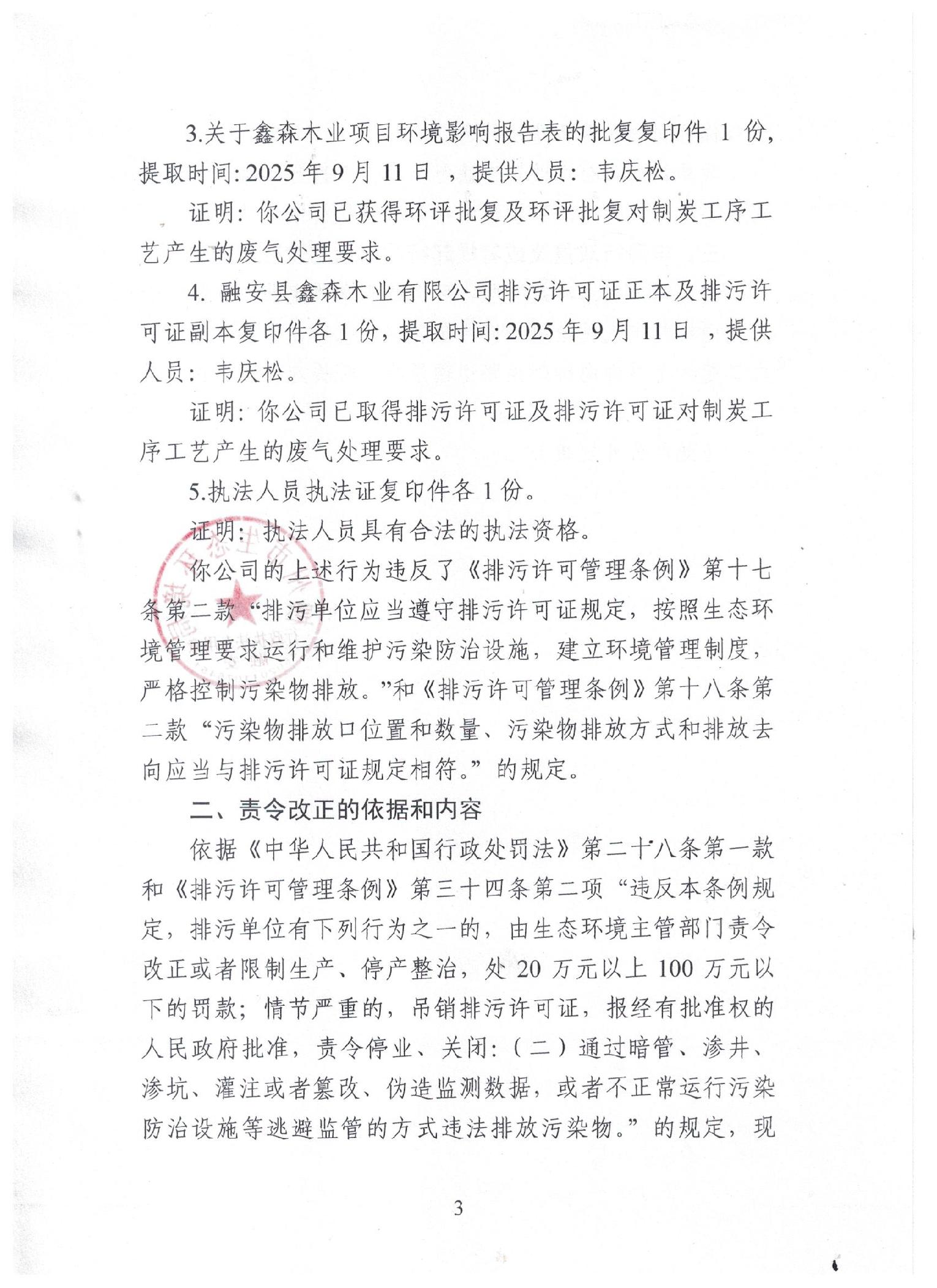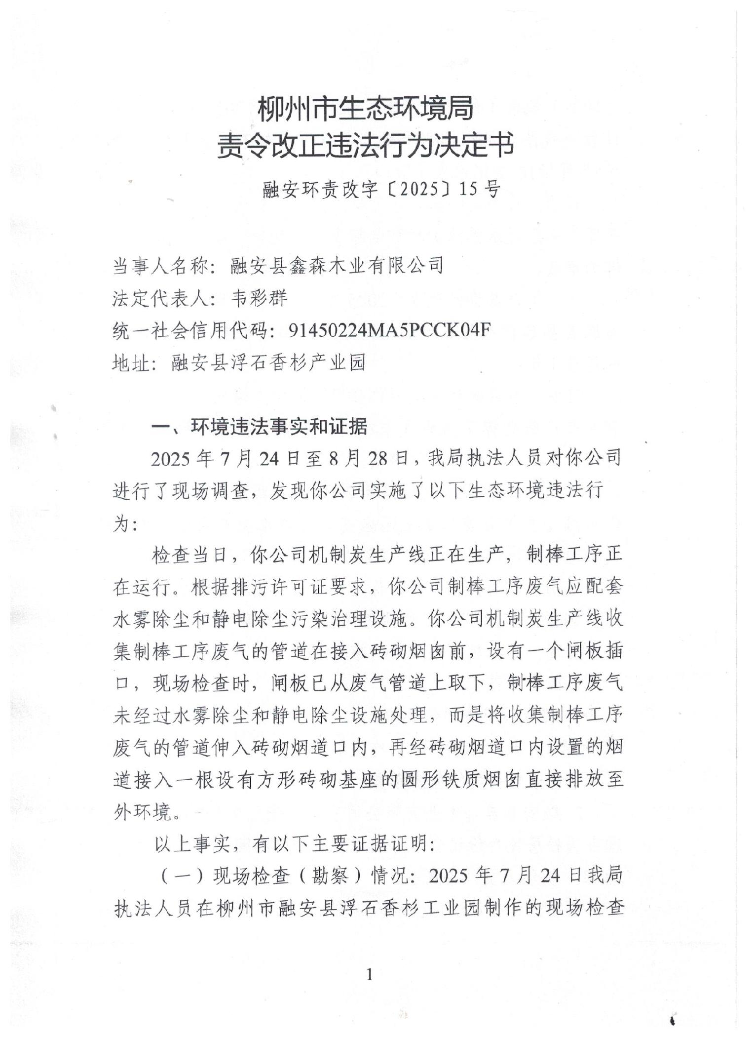 柳州市生态环境局责令改正违法行为决定书 融安环责改字〔2025〕15号融安县鑫森木业有限公司