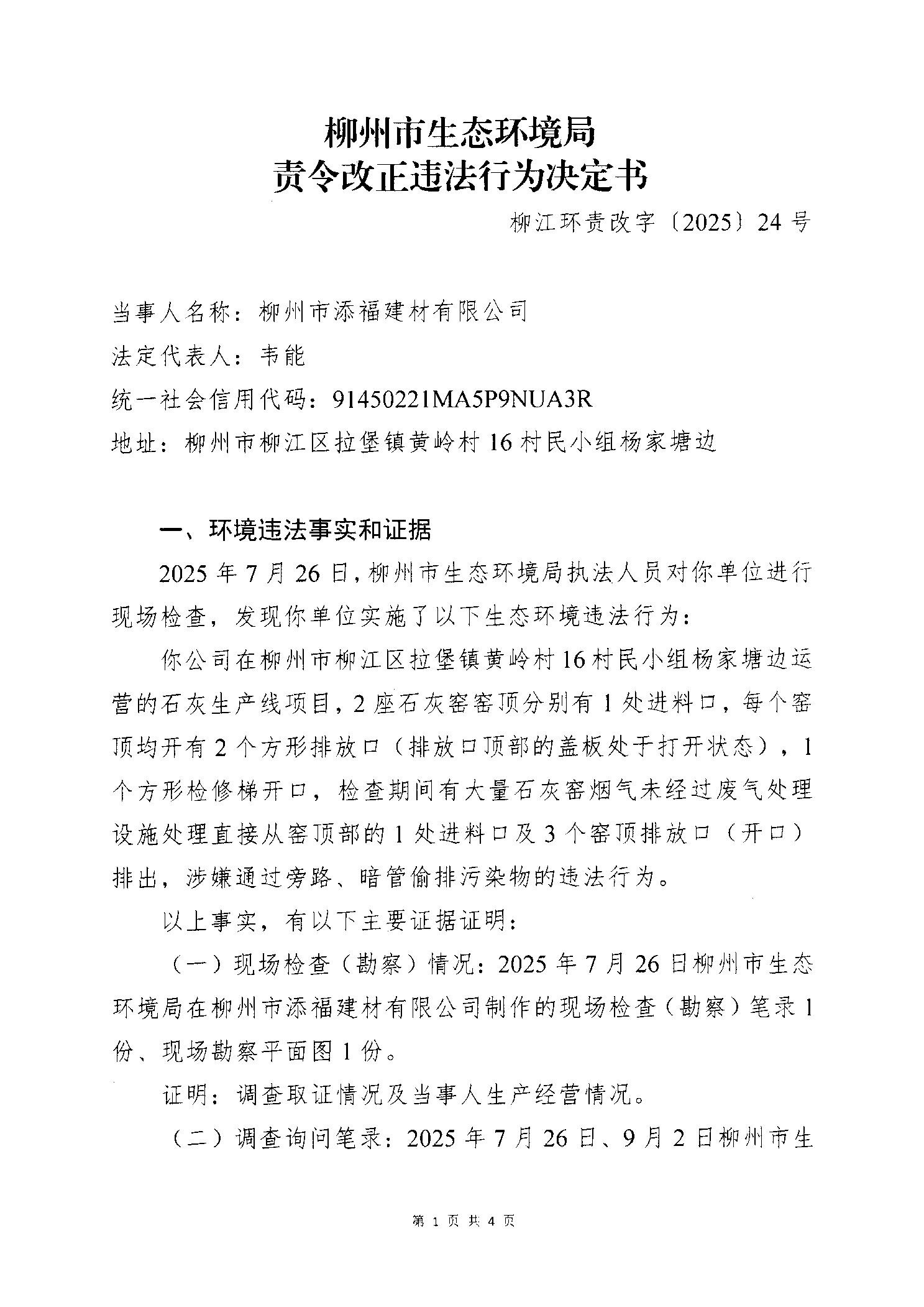 柳州市生态环境局责令改正违法行为决定书(柳江环责改字〔2025〕24号)柳州市添福建材有限公司.pdf