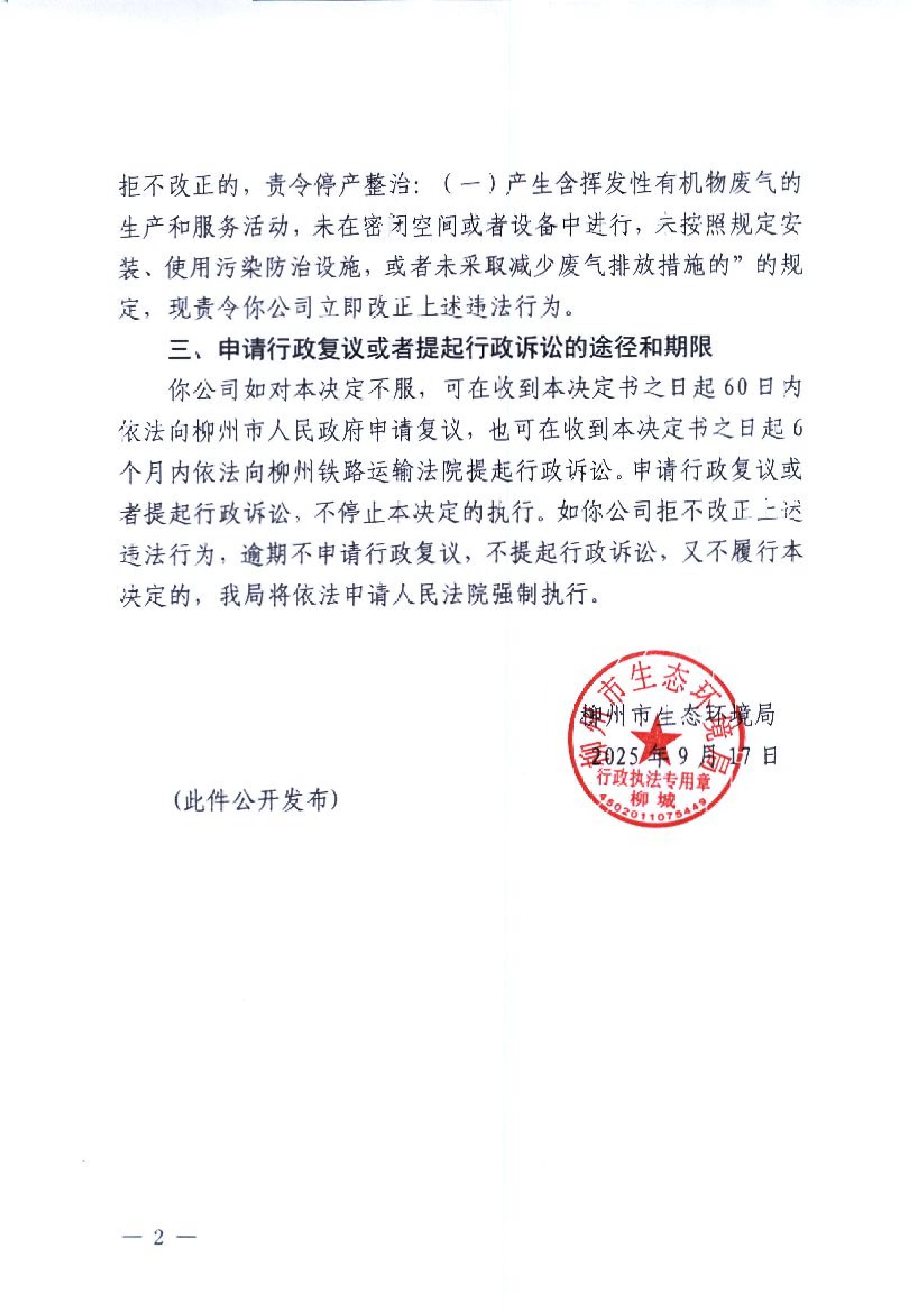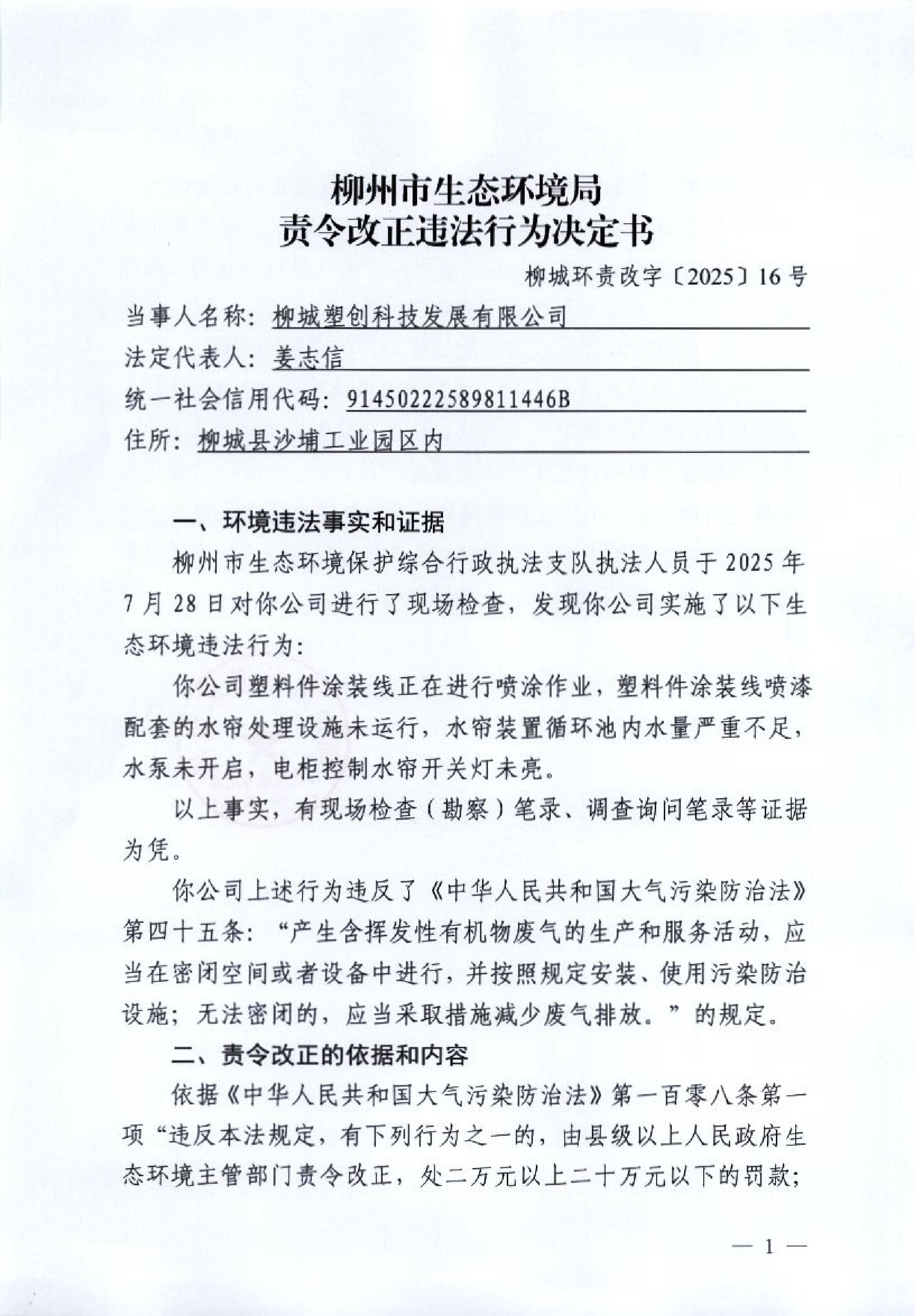 柳州市生态环境局责令改正违法行为决定书(柳城环责改字〔2025〕16号)柳城塑创科技发展有限公司