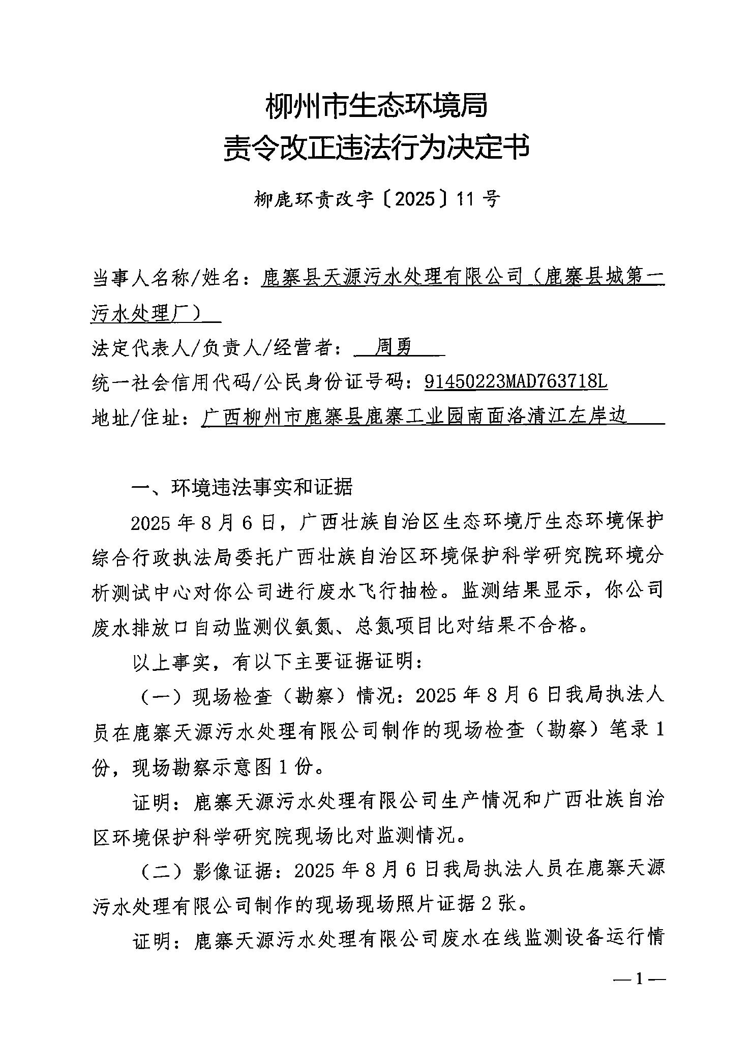 柳州市生态环境局责令改正违法行为决定书(柳鹿环责改字〔2025〕11号)鹿寨县天源污水处理有限公司(鹿寨县城第一污水处理厂)