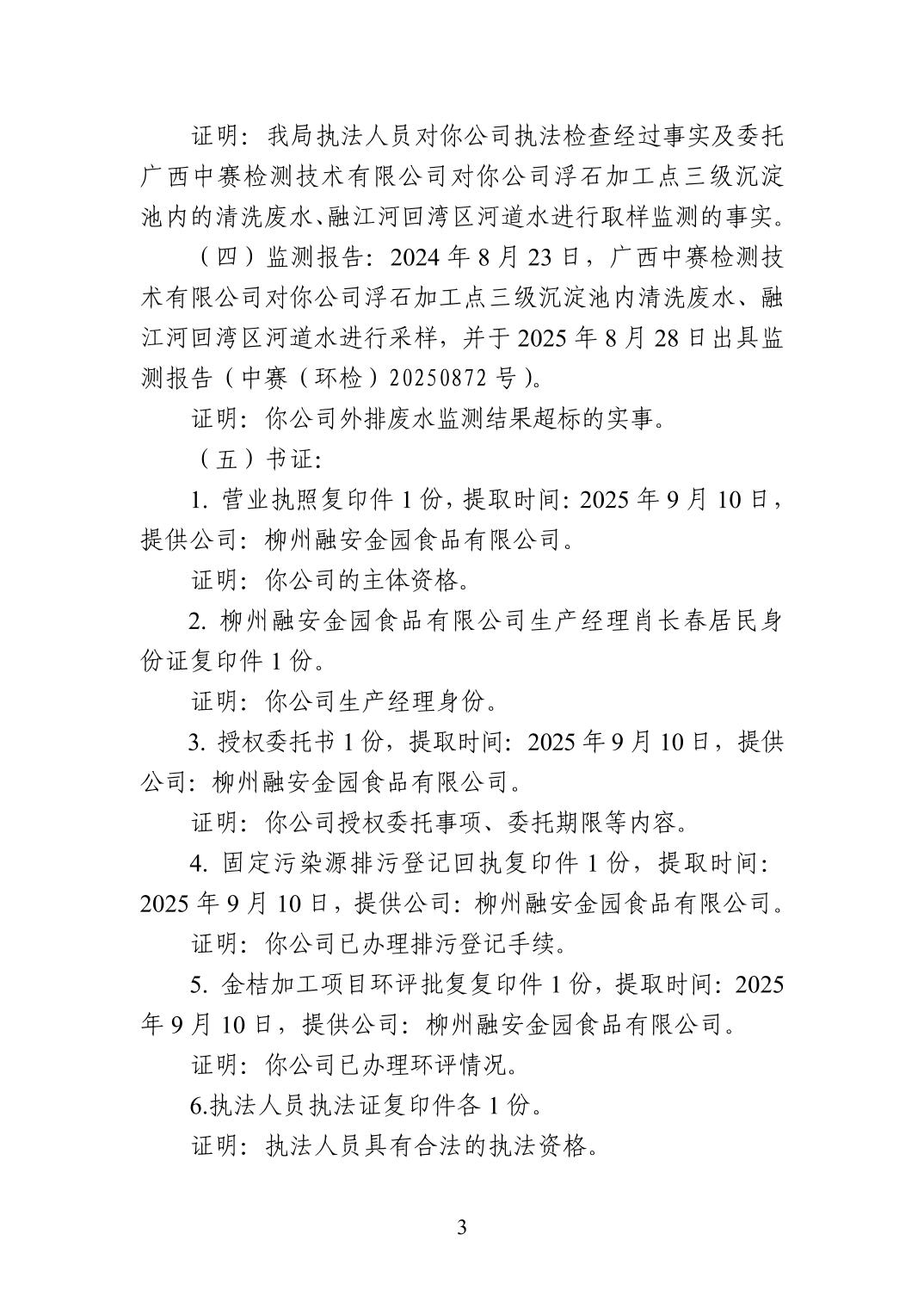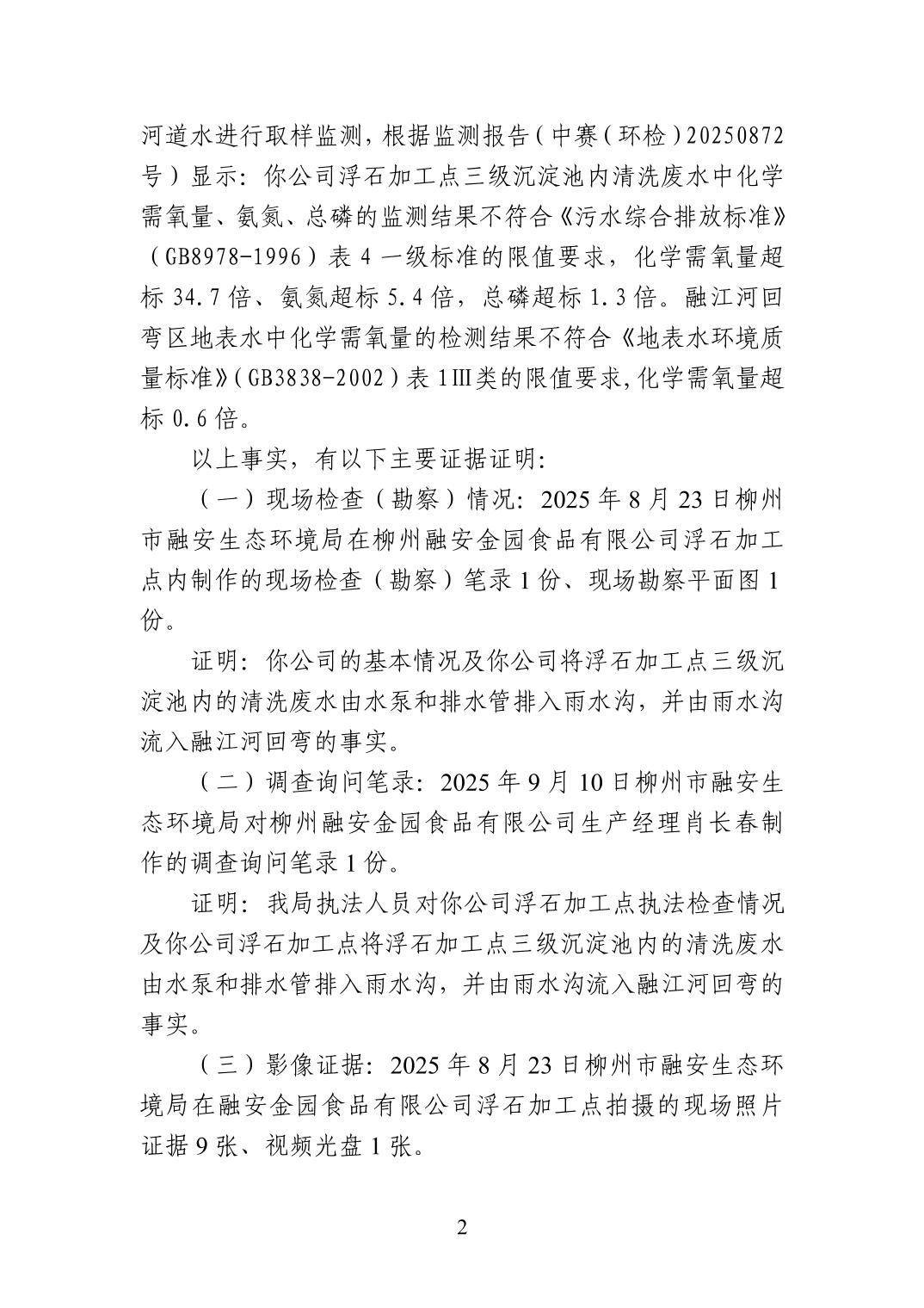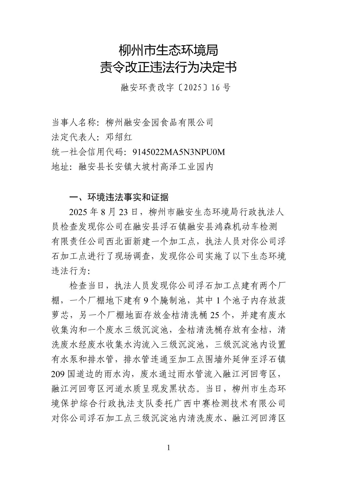 柳州市生态环境局责令改正违法行为决定书 融安环责改字〔2025〕16号柳州融安金园食品有限公司
