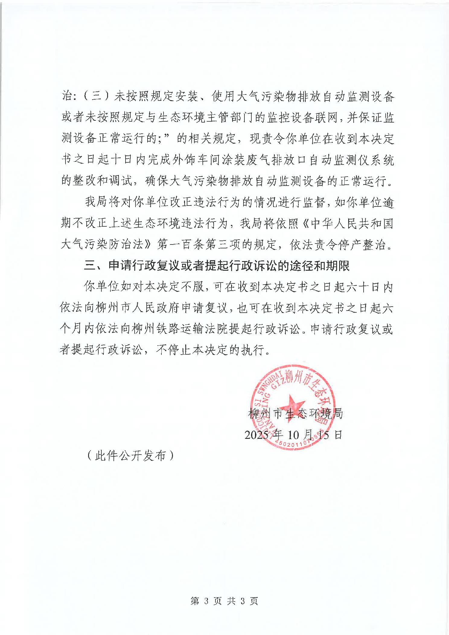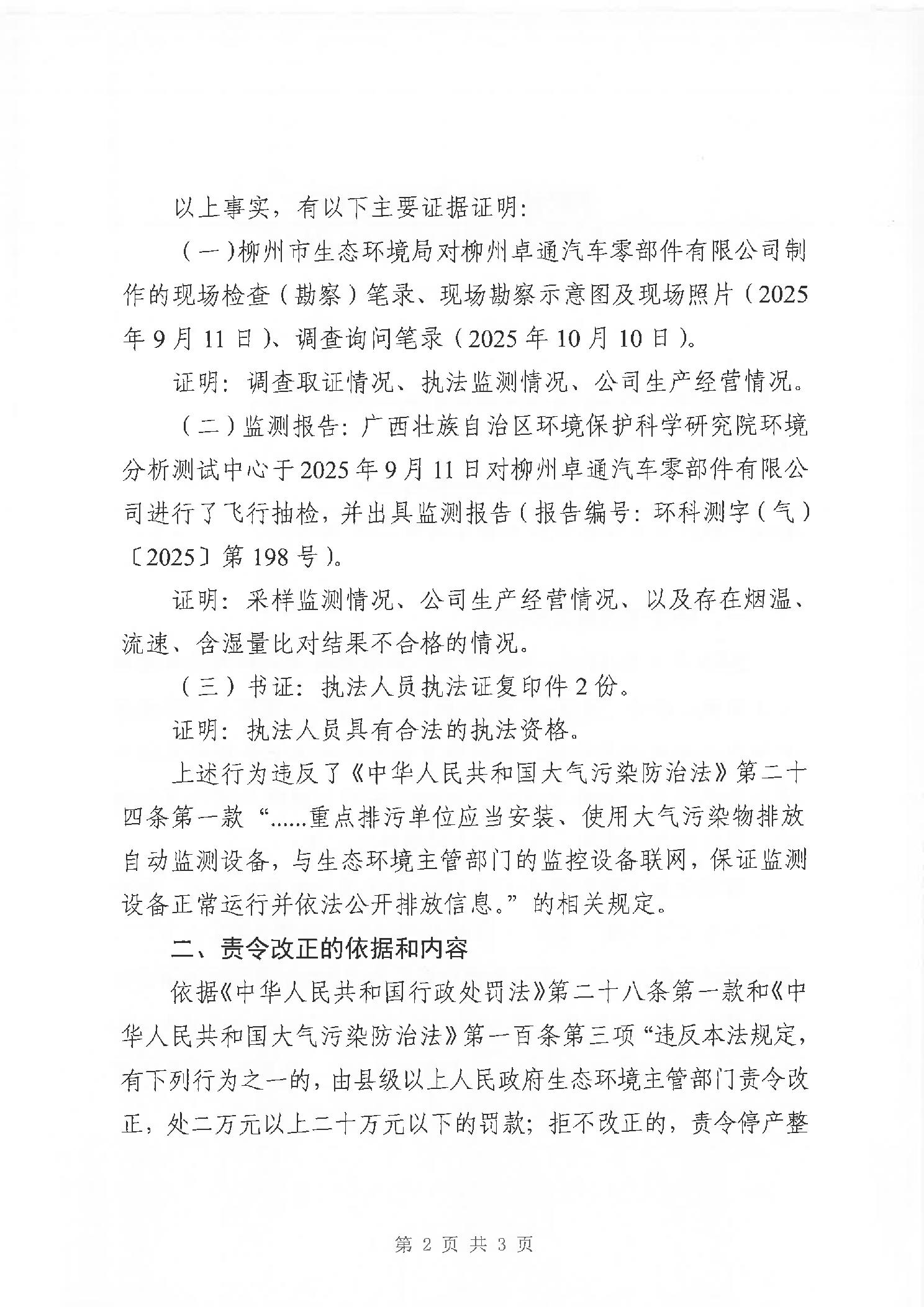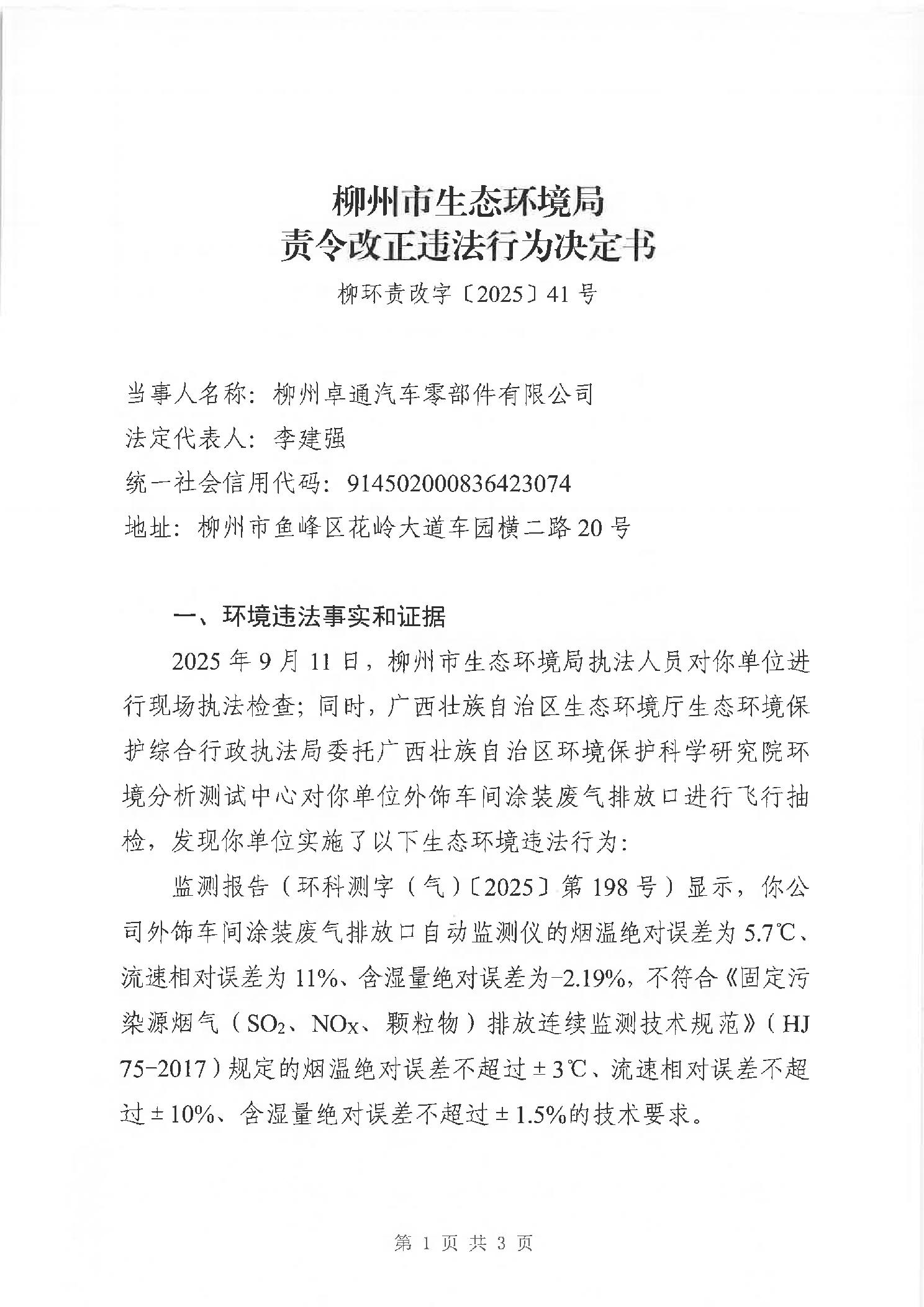 柳州市生态环境局责令改正违法行为决定书(柳环责改字〔2025〕41号)柳州卓通汽车零部件有限公司