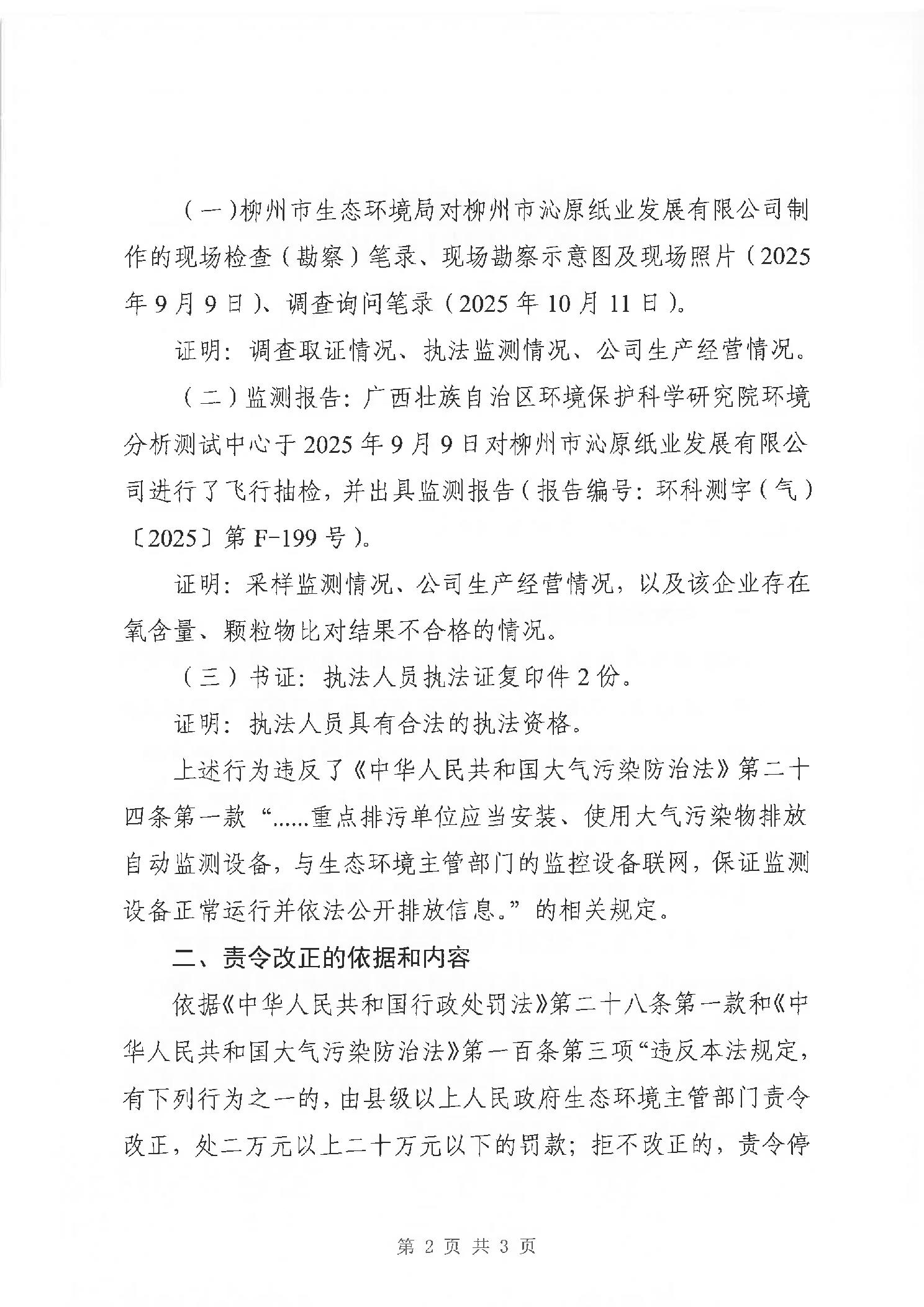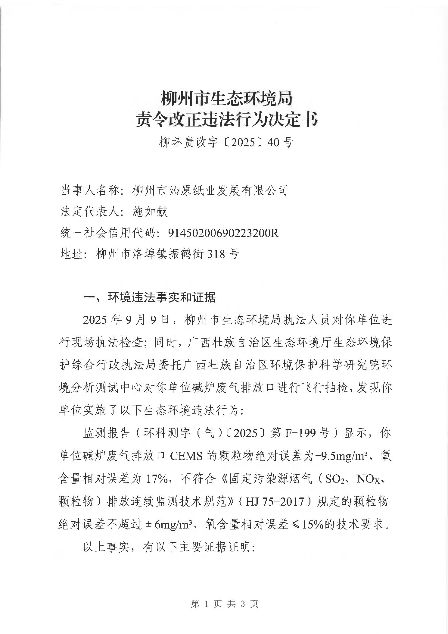 柳州市生态环境局责令改正违法行为决定书(柳环责改字〔2025〕40号)柳州市沁原纸业发展有限公司