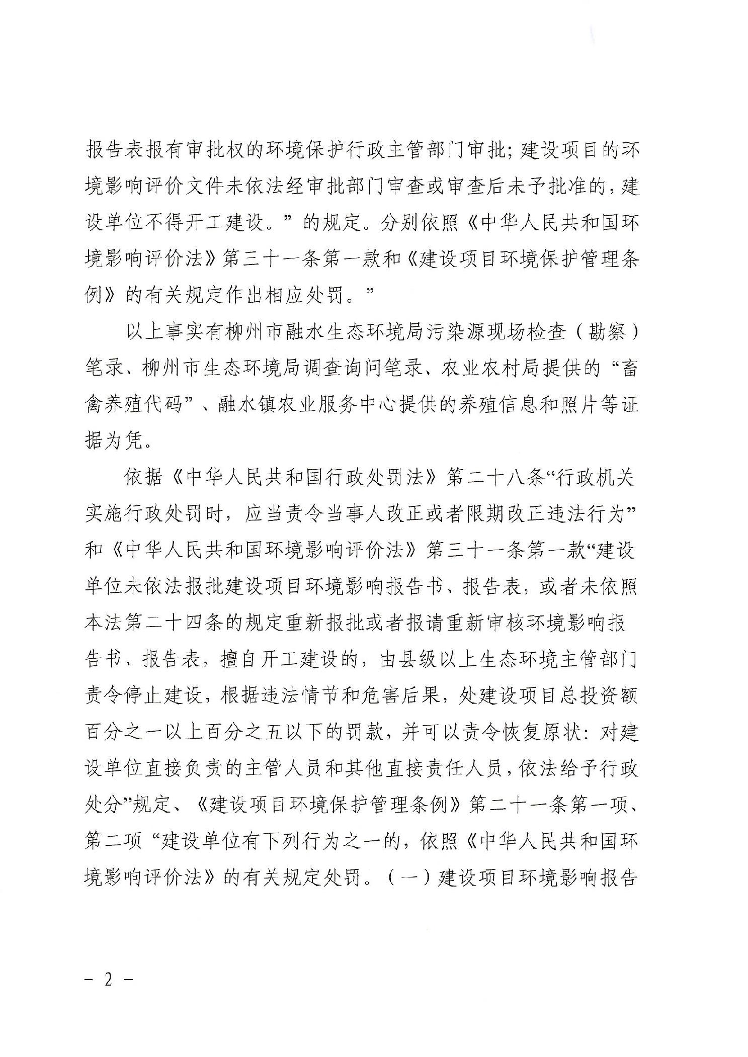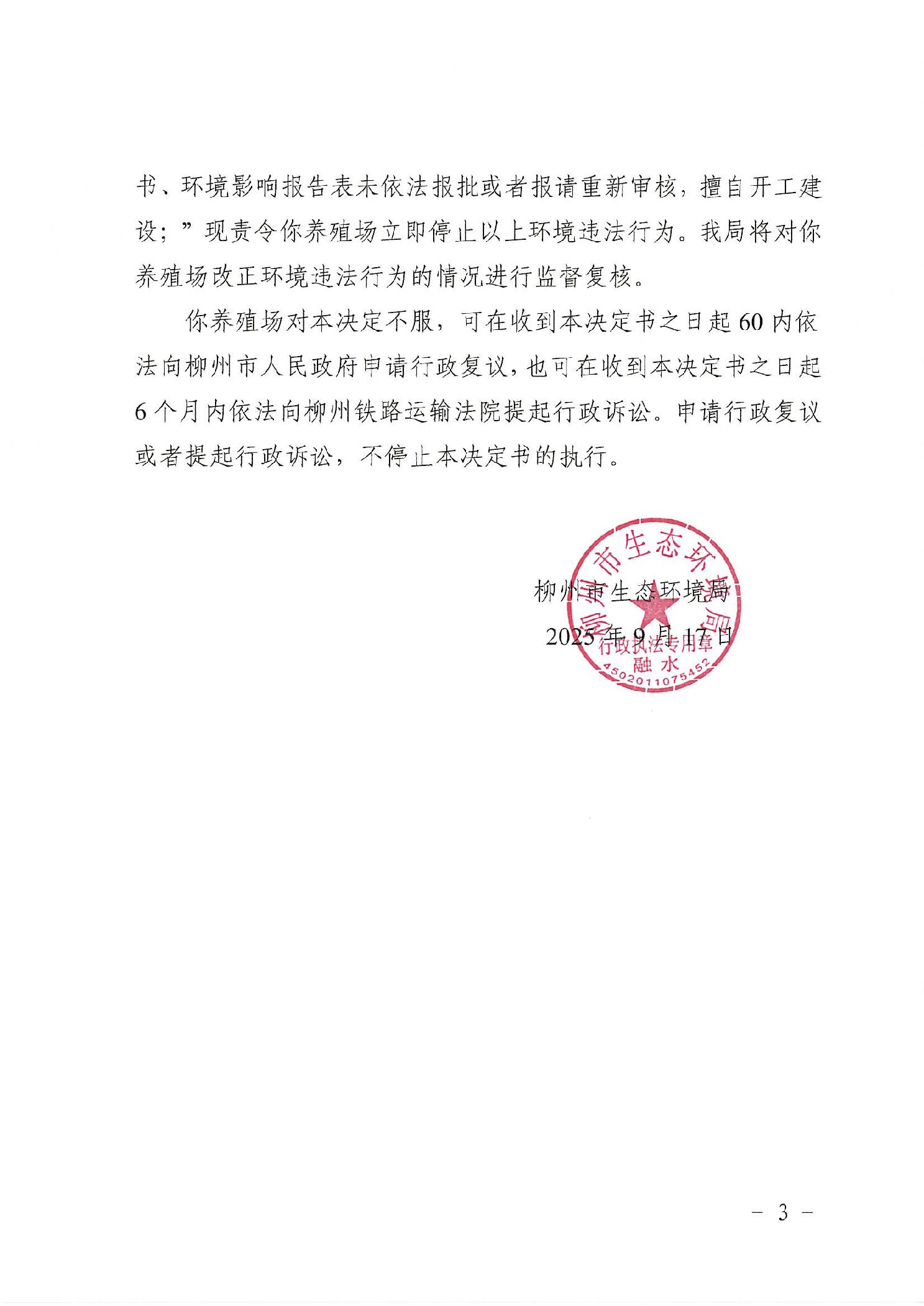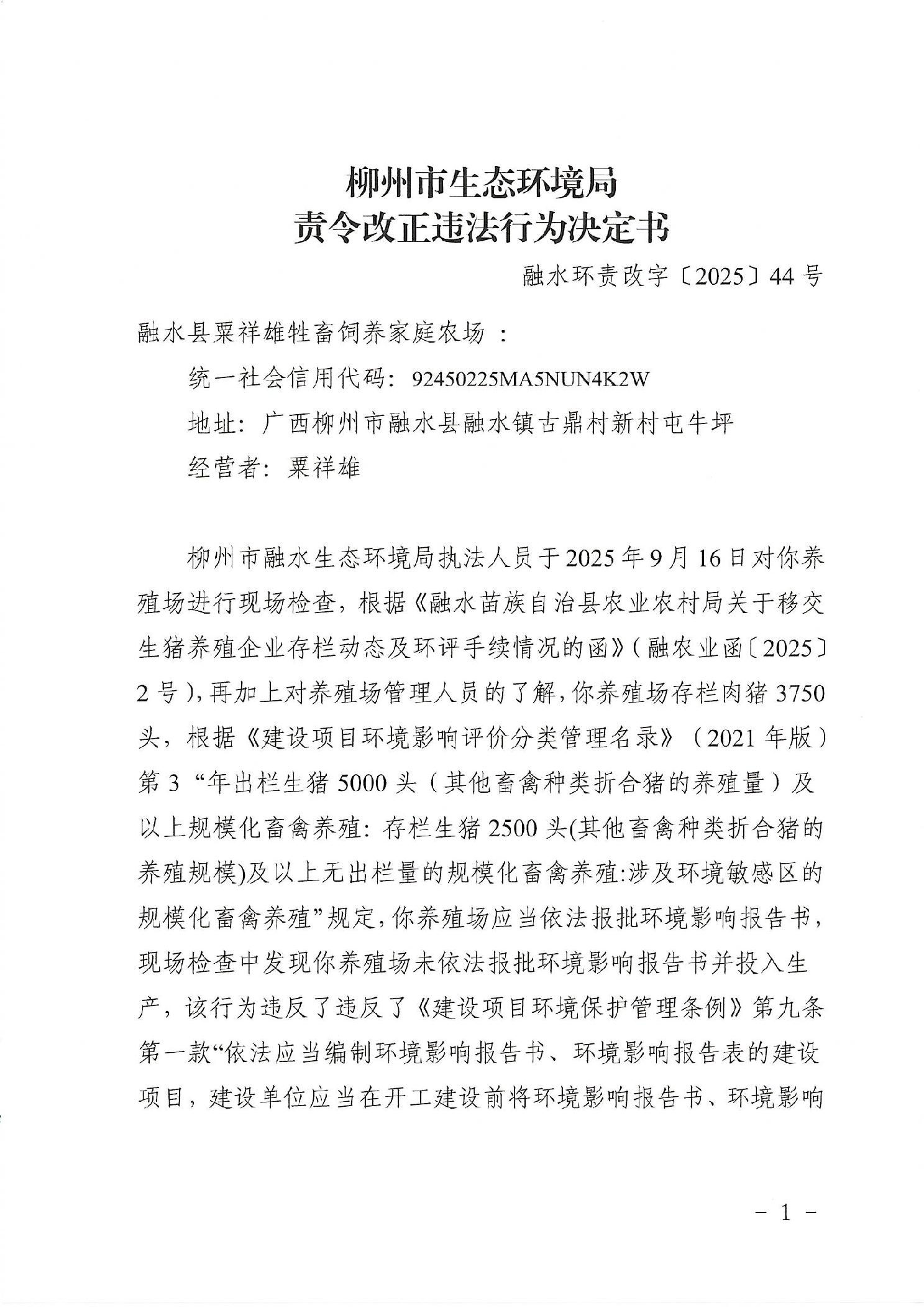 柳州市融水生态环境局责令改正违法行为决定书(融水环责改字《2025》44号)融水县粟祥雄牲畜饲养家庭农场