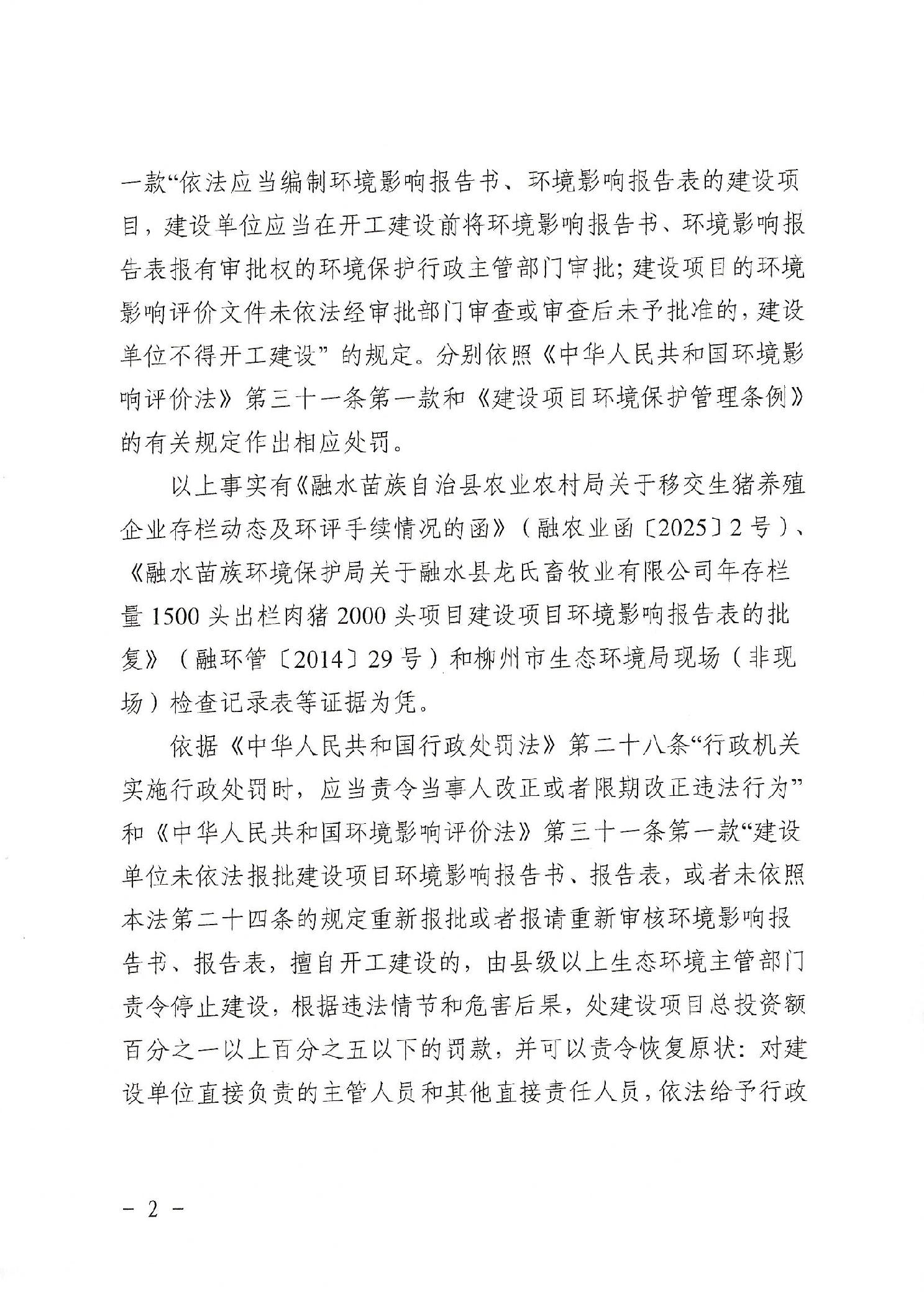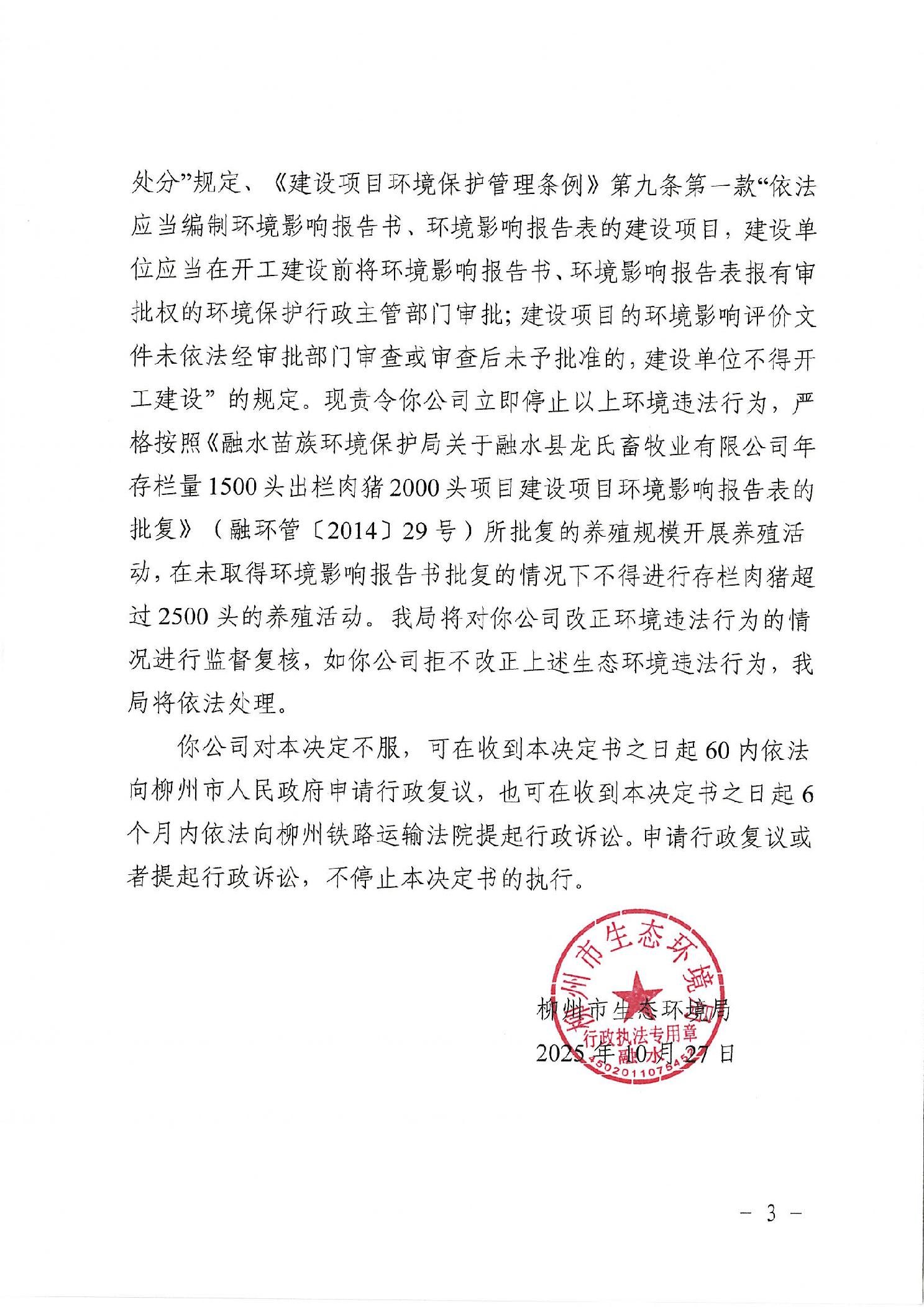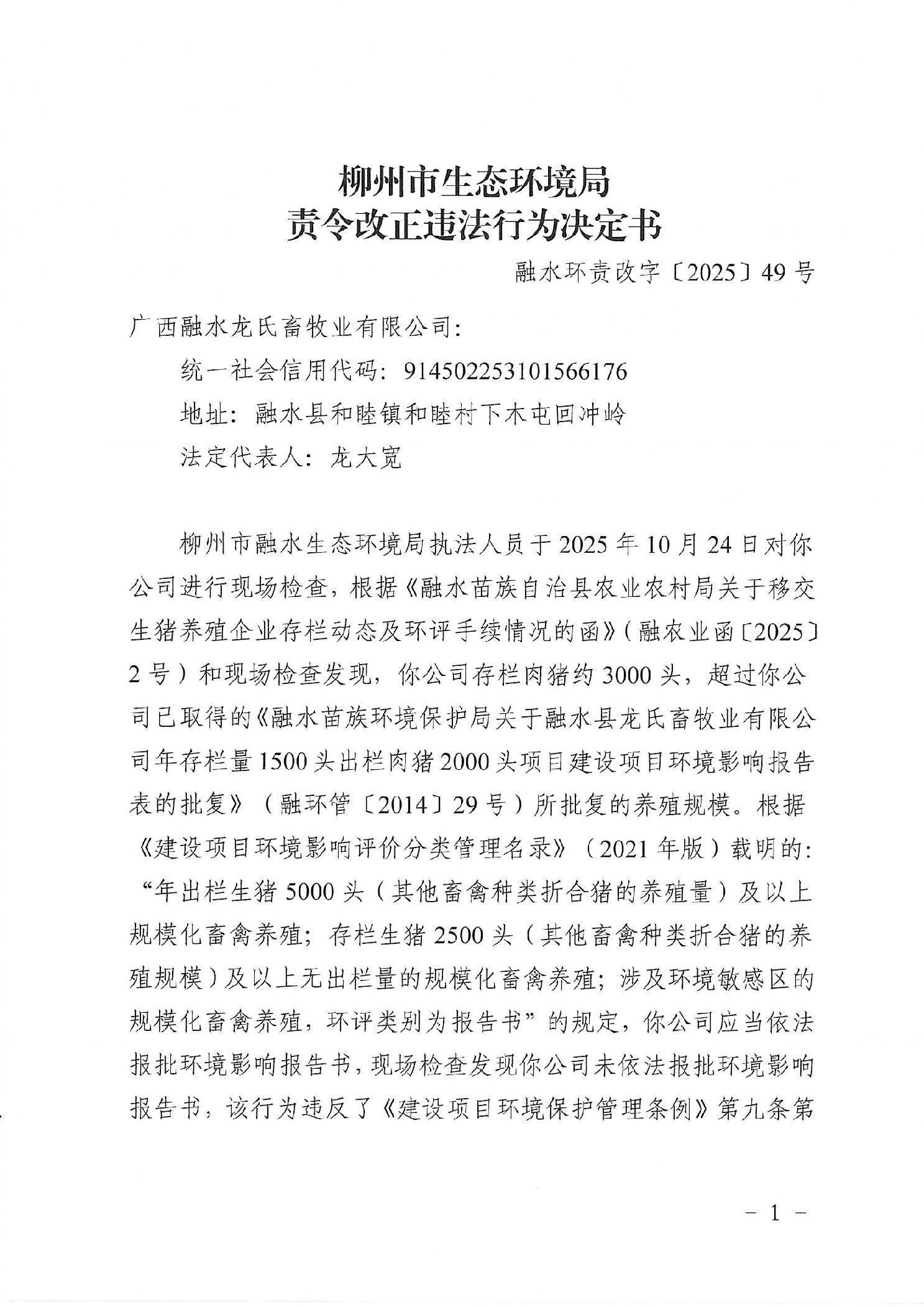 柳州市融水生态环境局责令改正违法行为决定书(融水环责改字《2025》49号)广西融水龙氏畜牧业有限公司