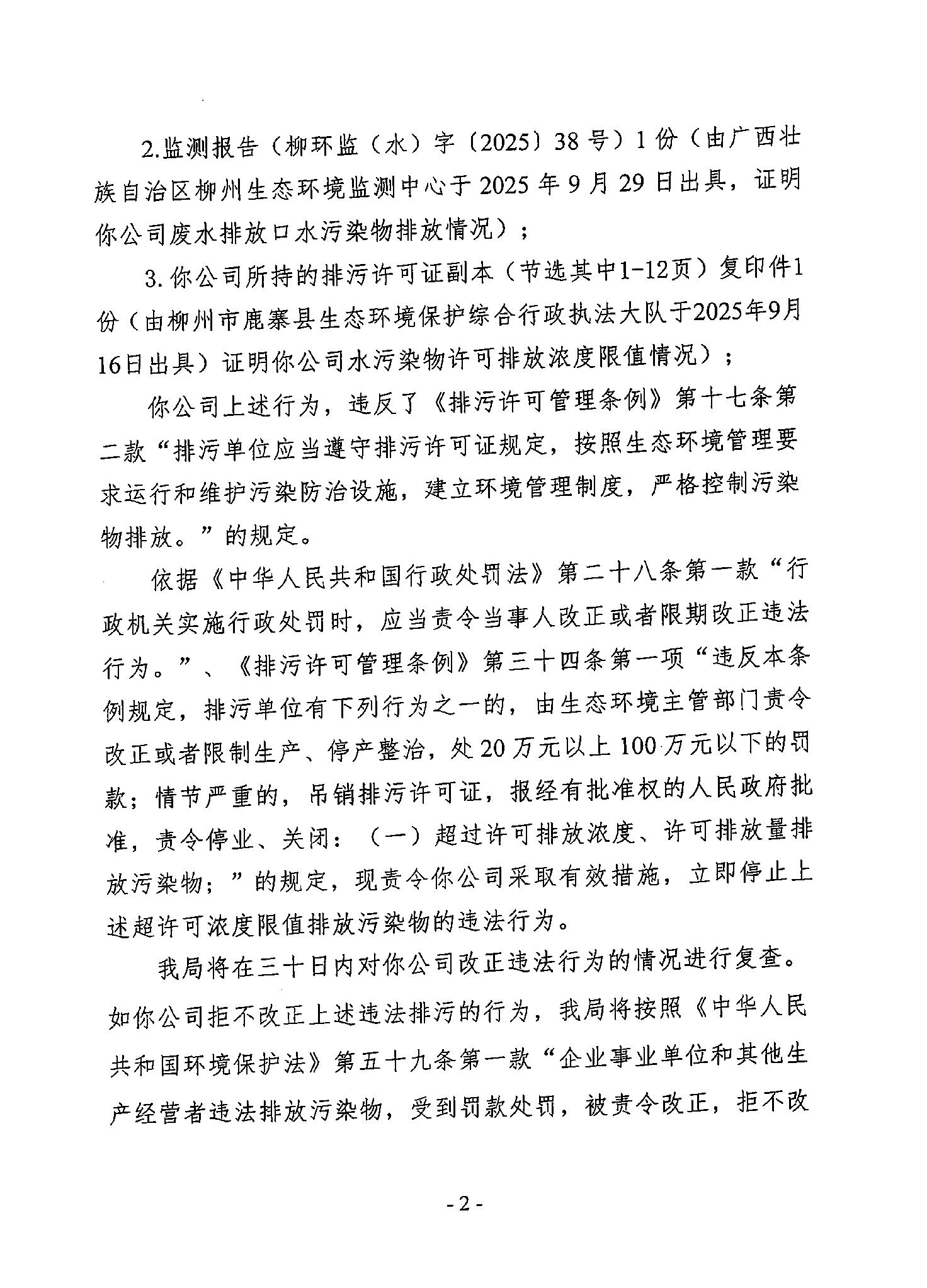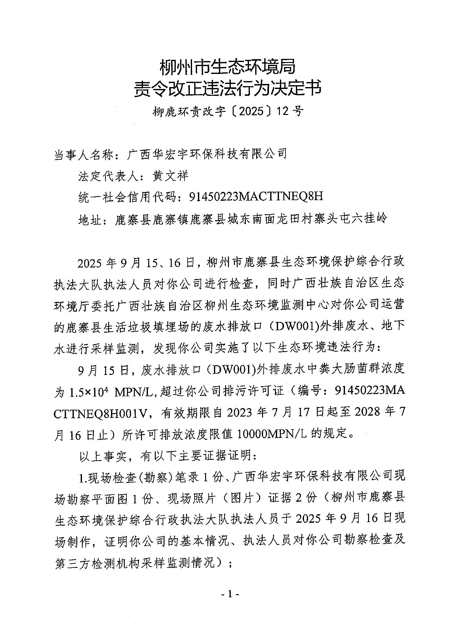 柳州市生态环境局责令改正违法行为决定书(柳鹿环责改字〔2025〕12号)广西华宏宇环保科技有限公司