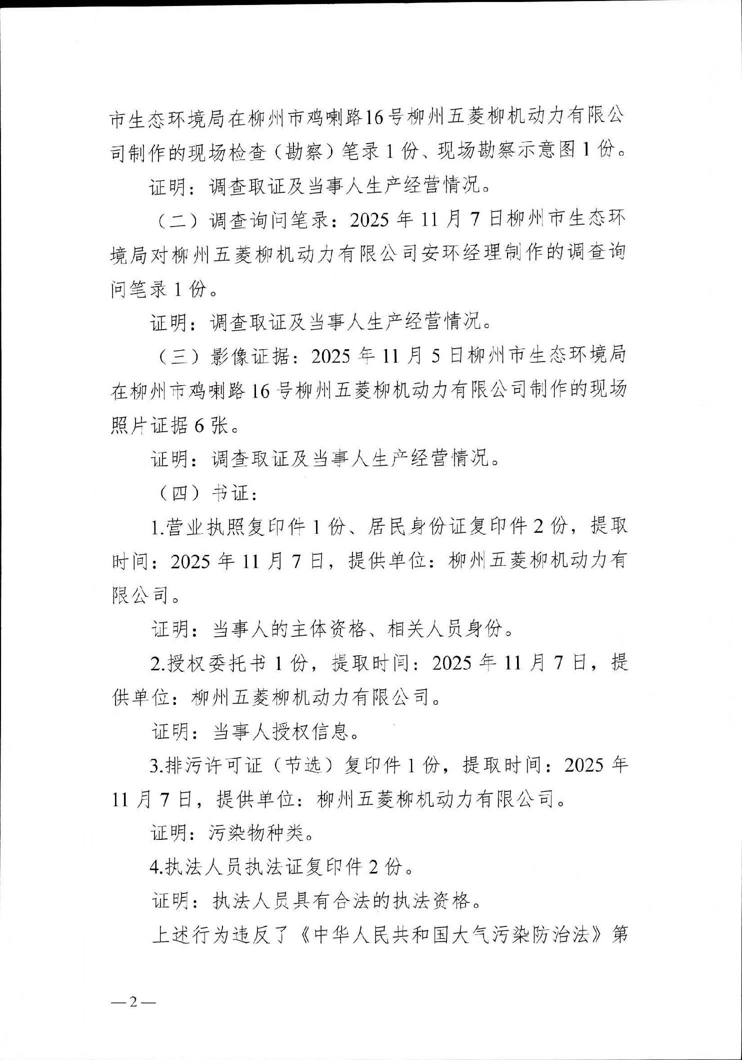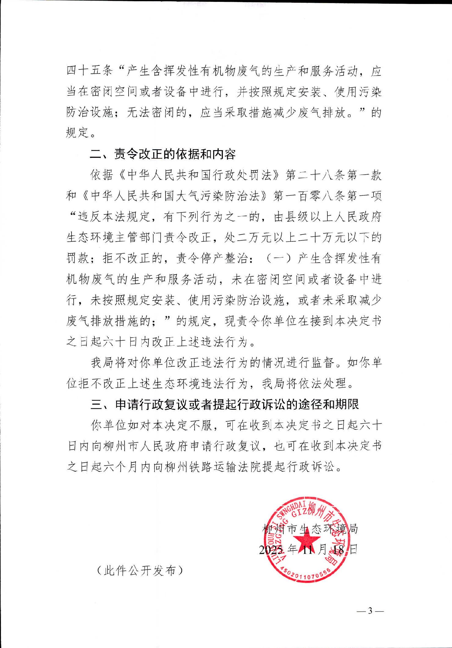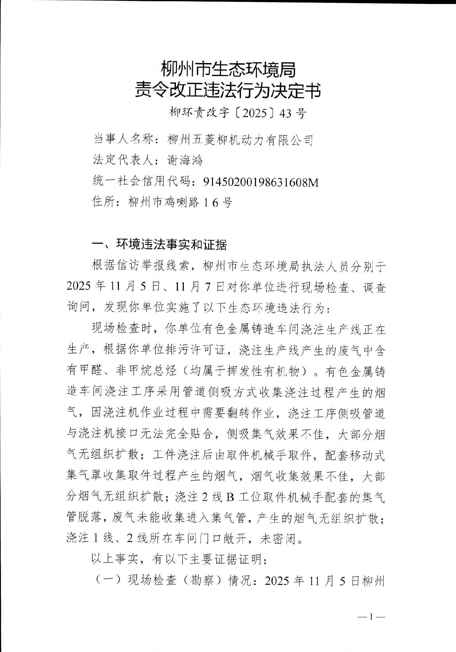 柳州市生态环境局责令改正违法行为决定书(柳环责改字〔2025〕43号)柳州五菱柳机动力有限公司责令改正违法行为决定书