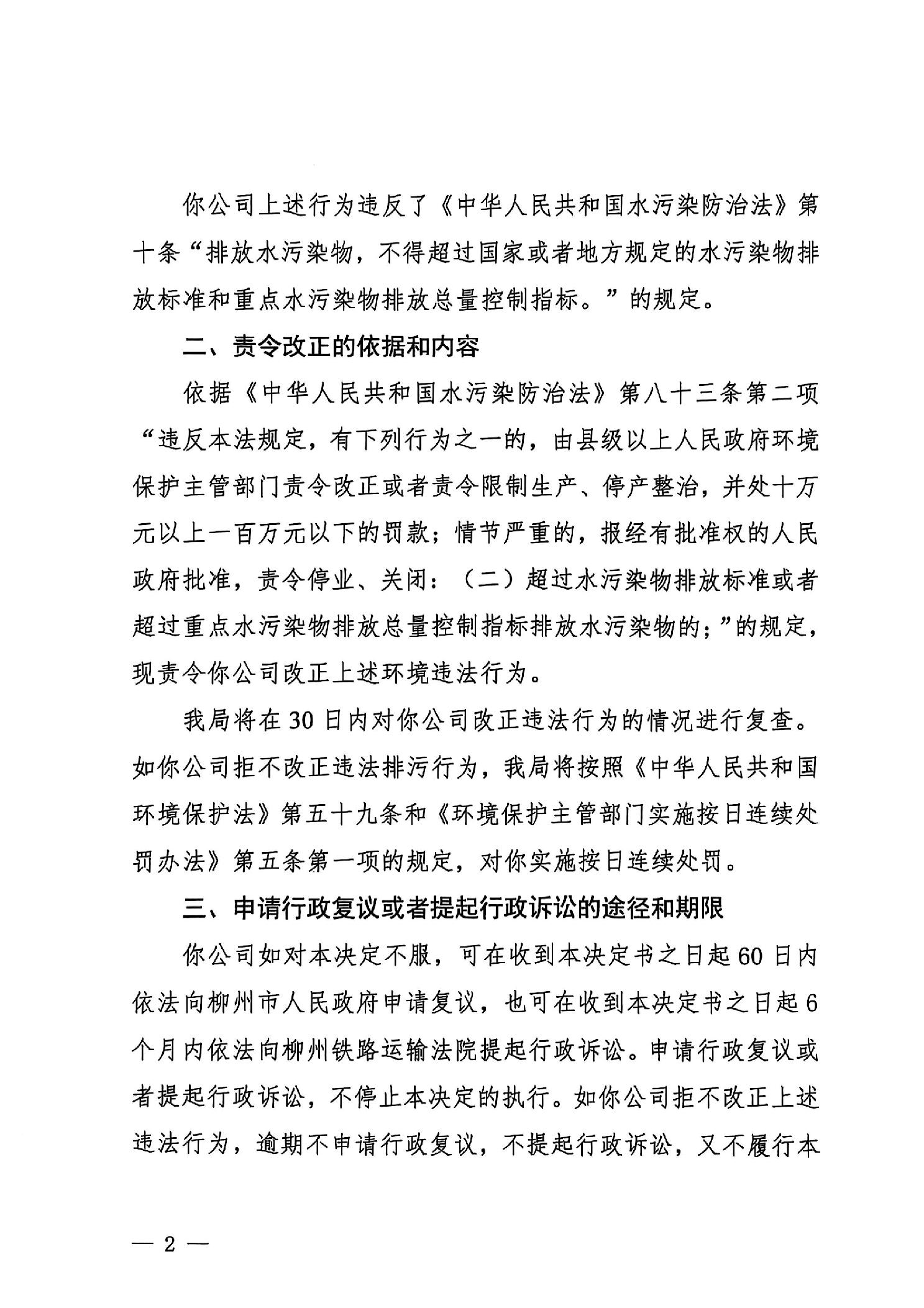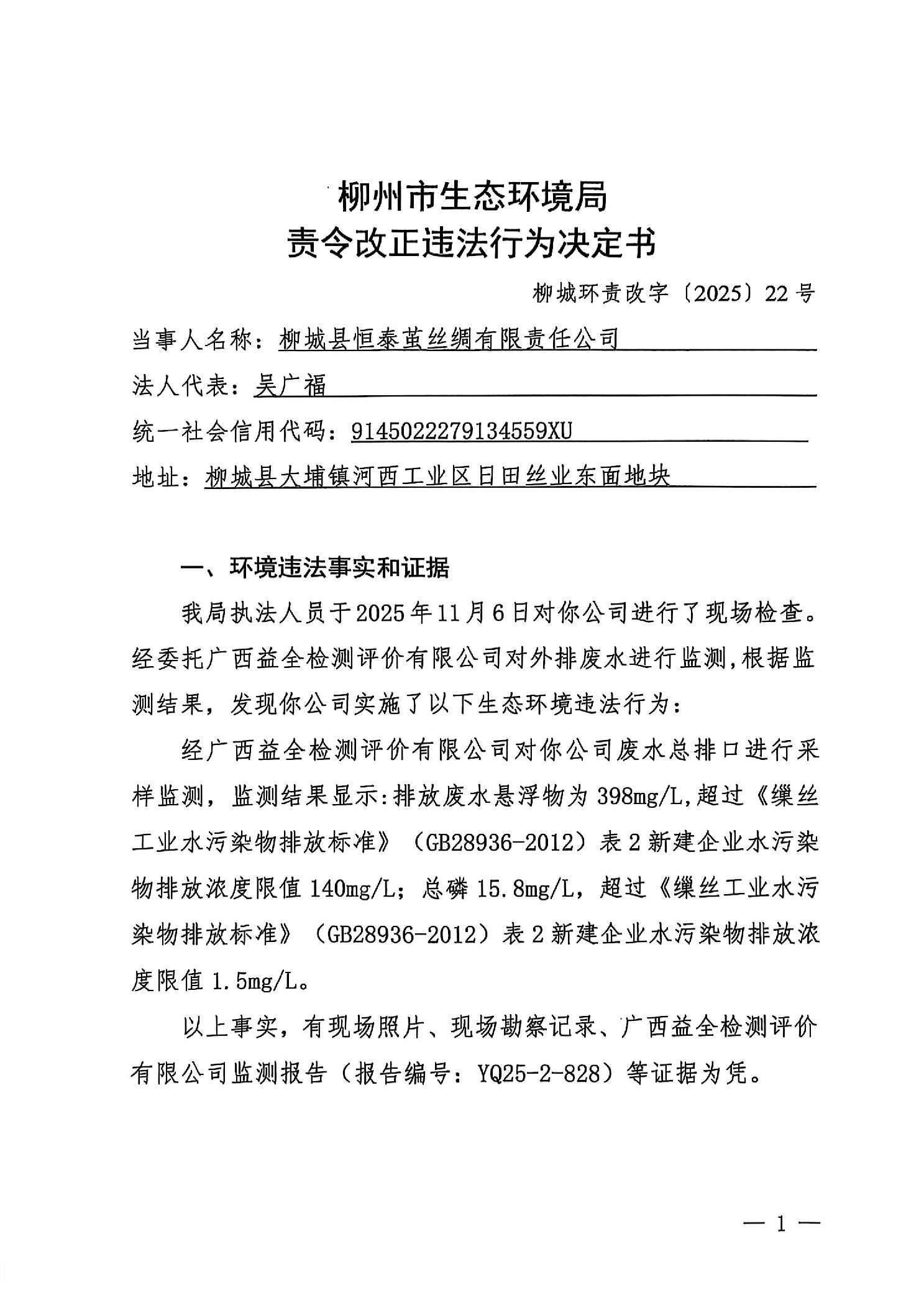 柳州市生态环境局责令改正违法行为决定书(柳城环责改字〔2025〕22号)(柳城县恒泰茧丝绸有限责任公司)