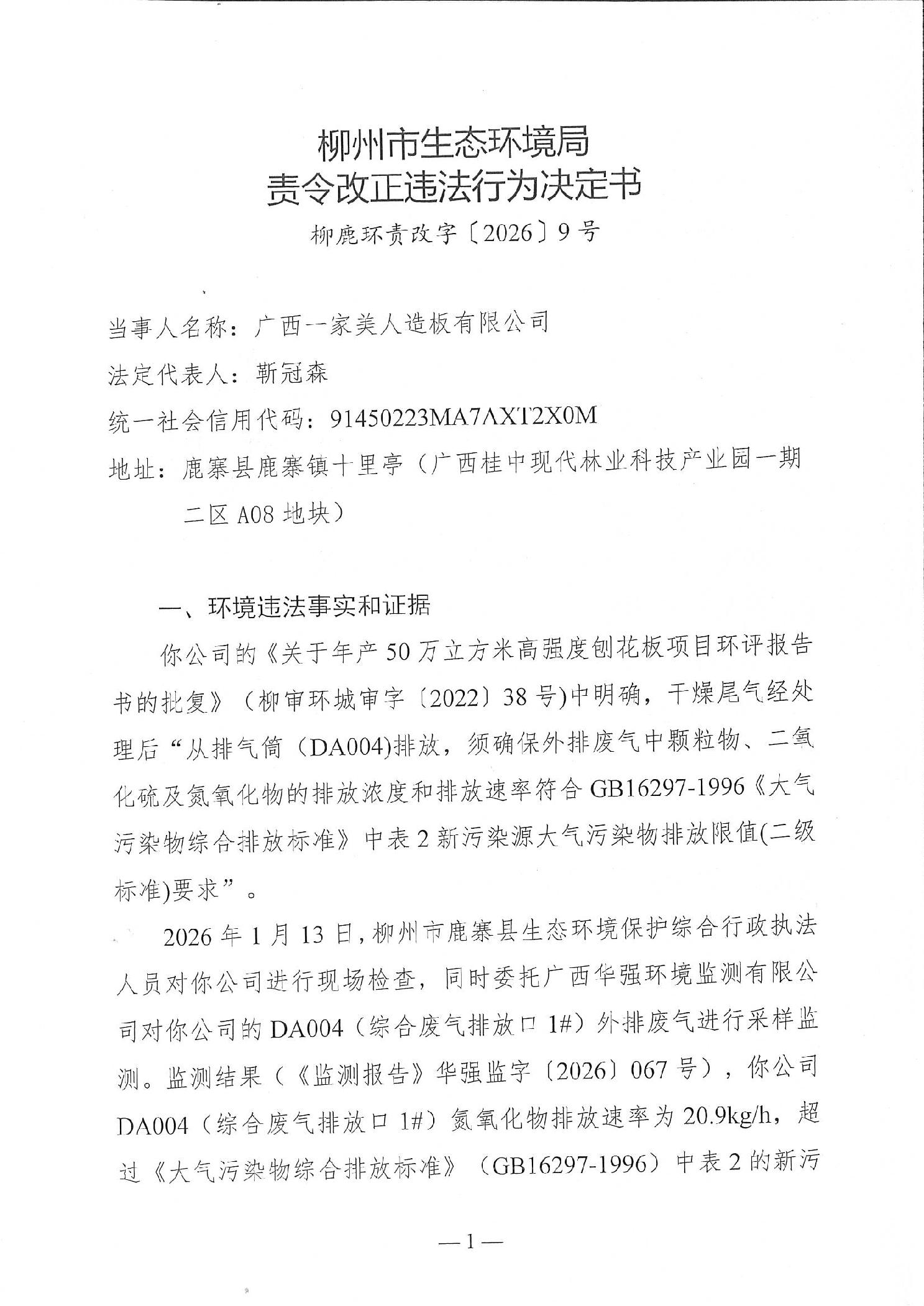 柳州市生态环境局责令改正违法行为决定书(柳鹿环责改字〔2026〕9号)广西一家美人造板有限公司.pdf