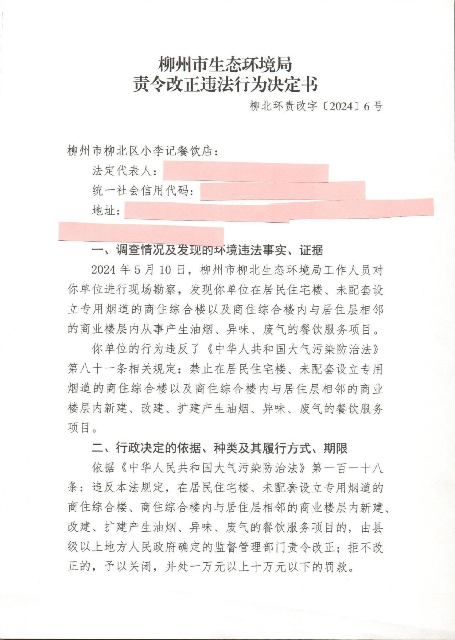 柳州市生态环境局责令改正违法行为决定书柳北环责改字(2024)6号 柳州市柳北区小李记餐饮店