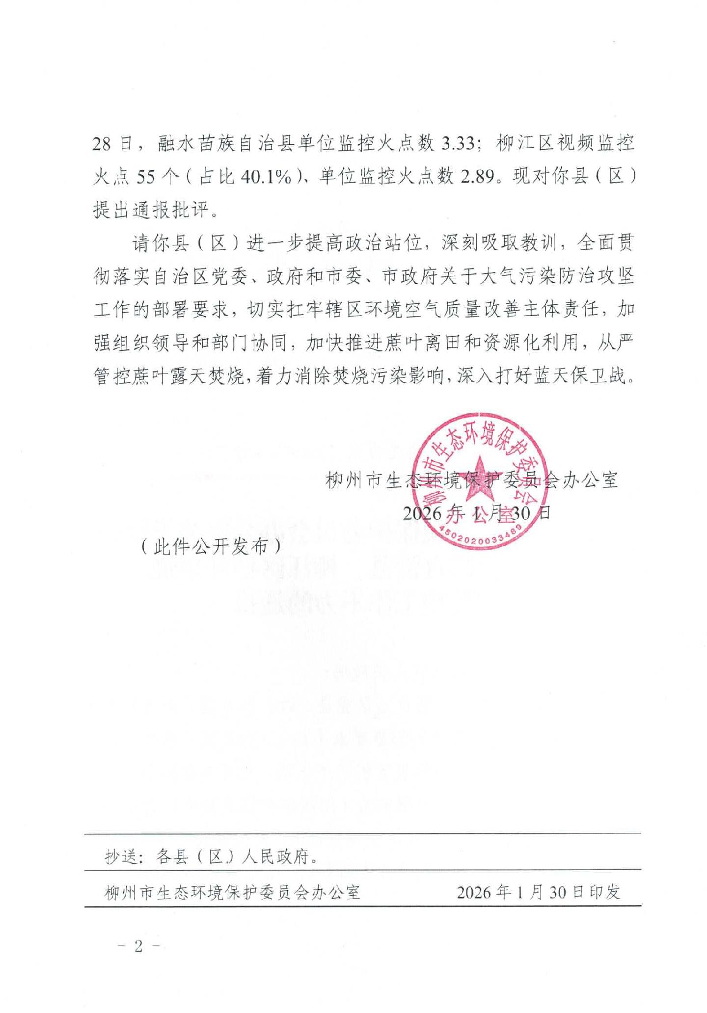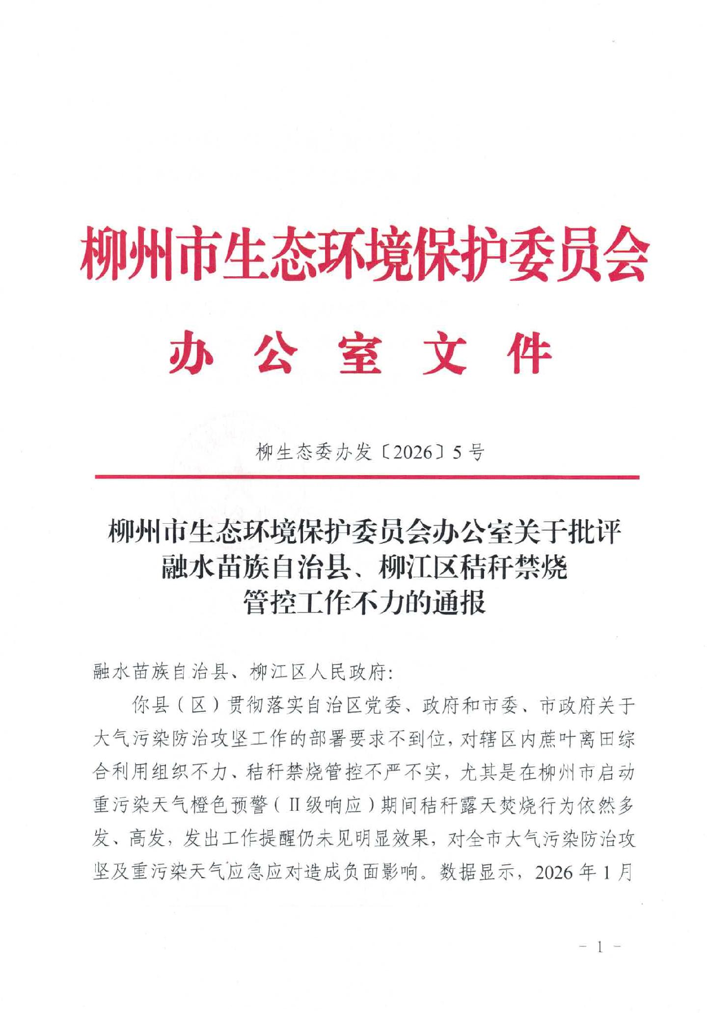 柳生态委办发〔2026〕5号柳州市生态环境保护委员会办公室关于批评融水苗族自治县、柳江区秸秆禁烧管控工作不力的通报