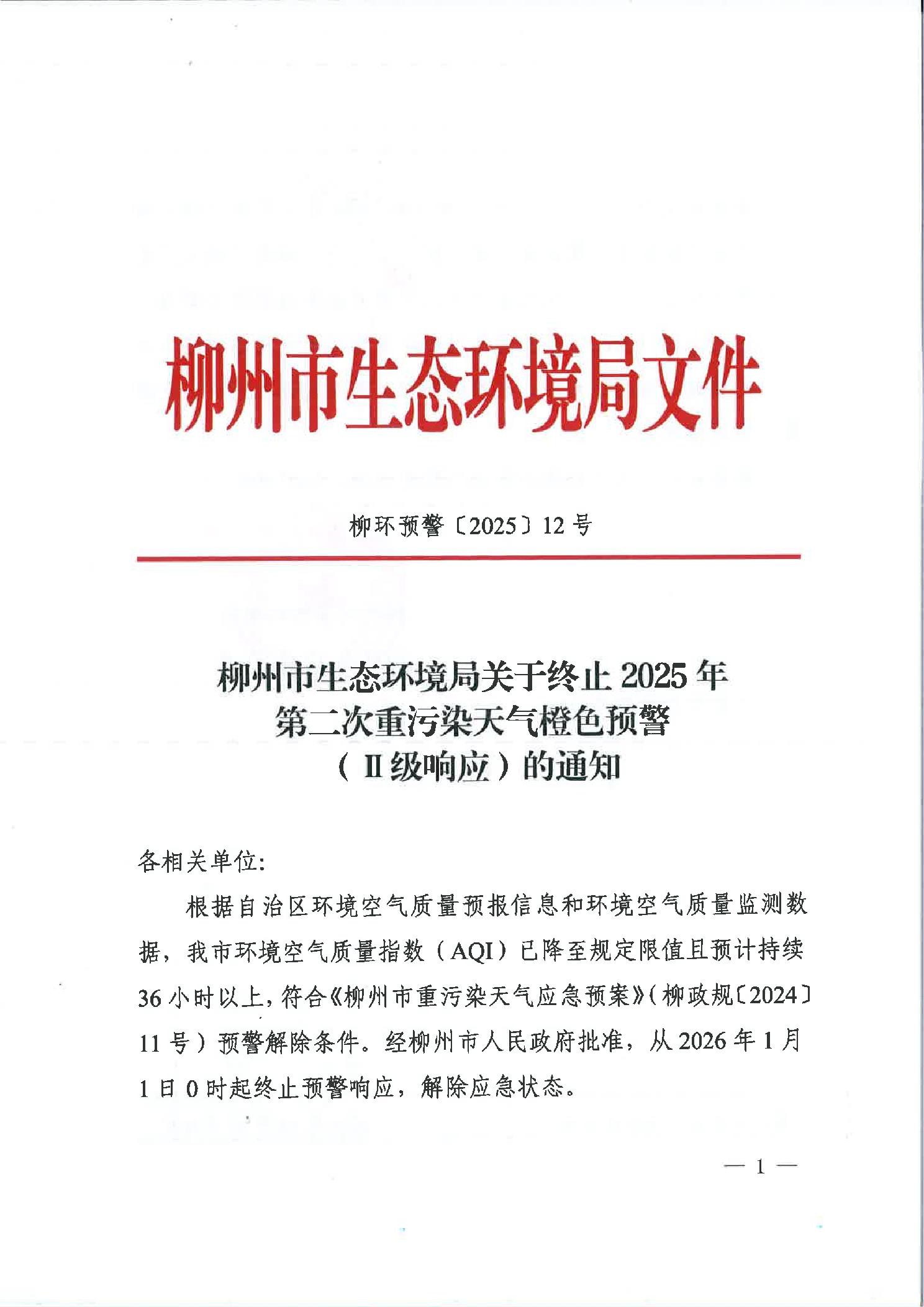 柳环预警〔2025〕12号柳州市生态环境局关于终止2025年第二次重污染天气橙色预警(Ⅱ级响应)的通知