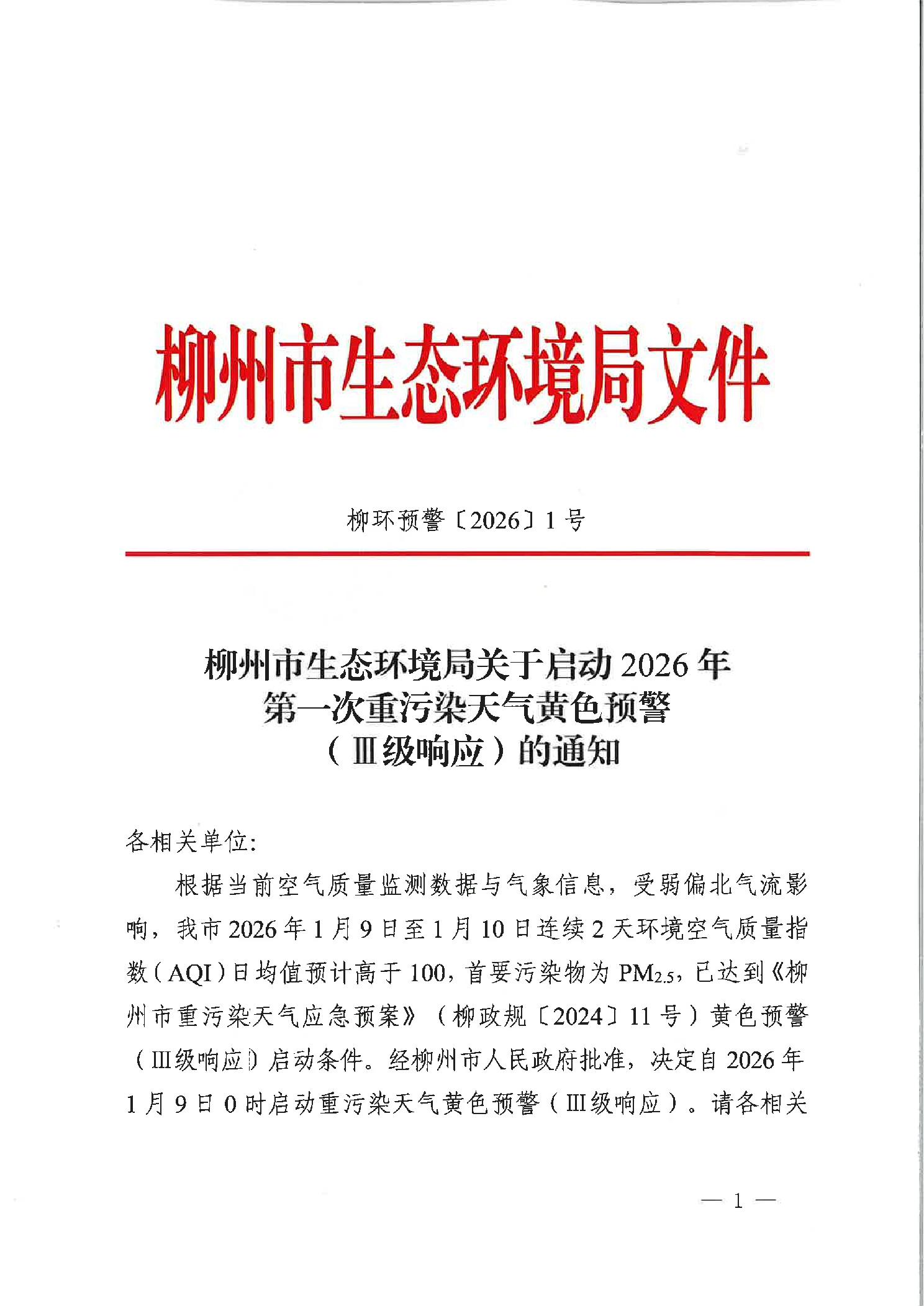柳环预警〔2026〕1号柳州市生态环境局关于启动2026年第一次重污染天气黄色预警(Ⅲ级响应)的通知