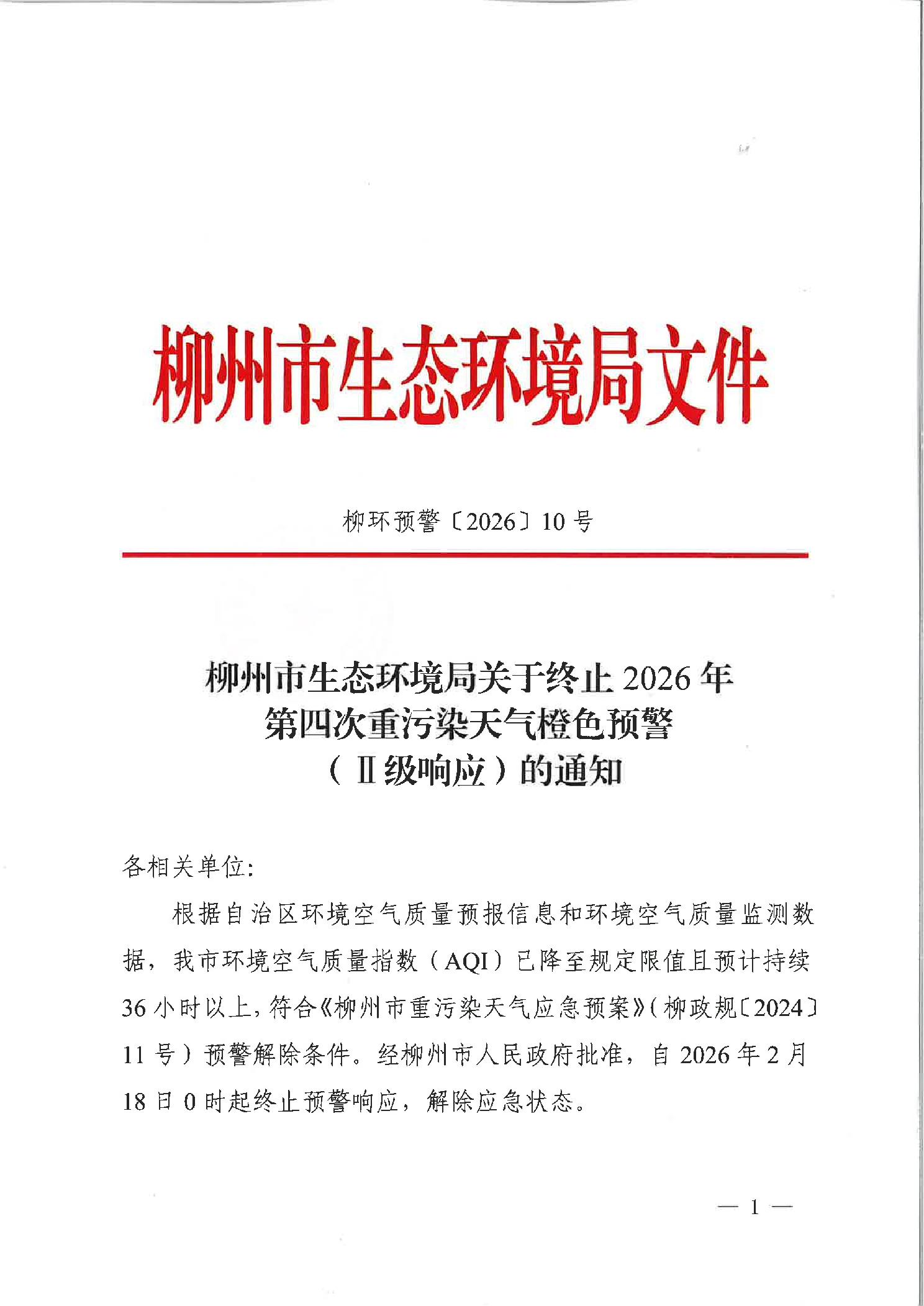 柳环预警〔2026〕10号柳州市生态环境局关于终止2026年第四次重污染天气橙色预警(Ⅱ级响应)的通知
