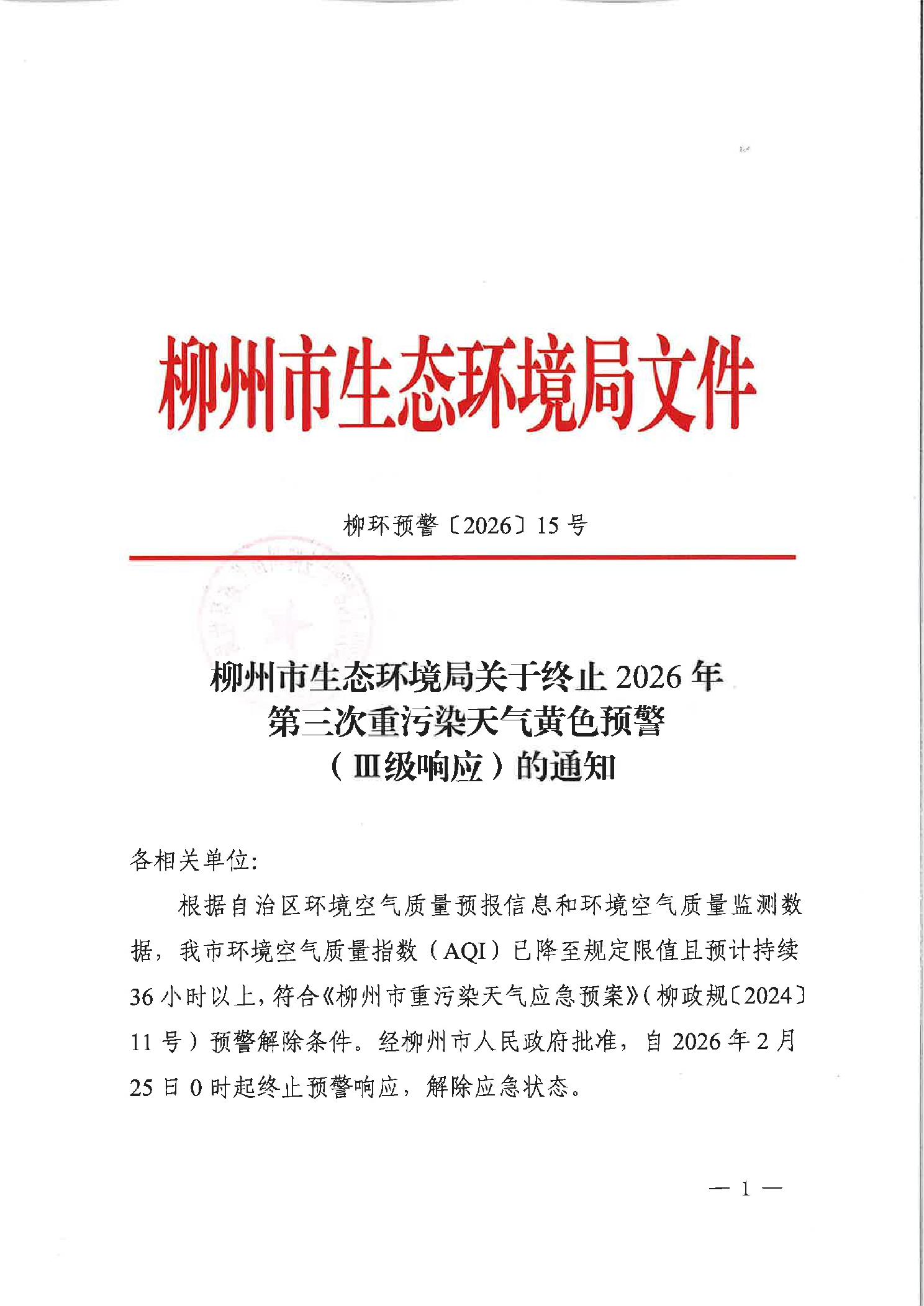 柳环预警〔2026〕15号柳州市生态环境局关于终止2026年第三次重污染天气黄色预警((Ⅲ级响应)的通知