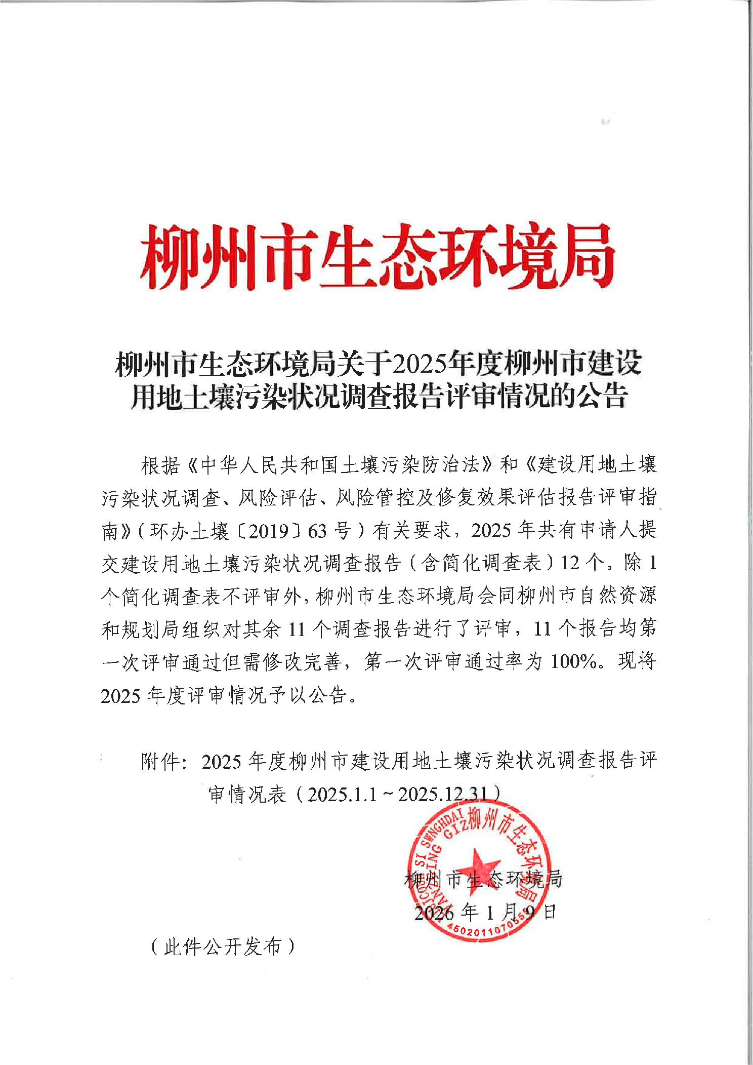 柳州市生态环境局关于2025年度柳州市建设用地土壤污染状况调查报告评审情况的公告
