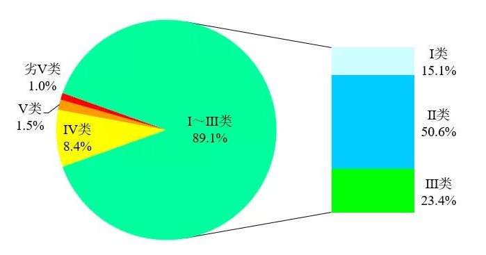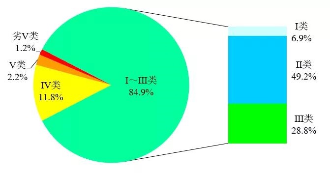1-12月,3641个国家地表水考核断面中,水质优良(Ⅰ~Ⅲ类)断面比例为84.9%,与2020年相比上升1.5个百分点;劣Ⅴ类断面比例为1.2%,均达到2021年水质目标要求。主要污染指标为化学需氧量、高锰酸盐指数和总磷。