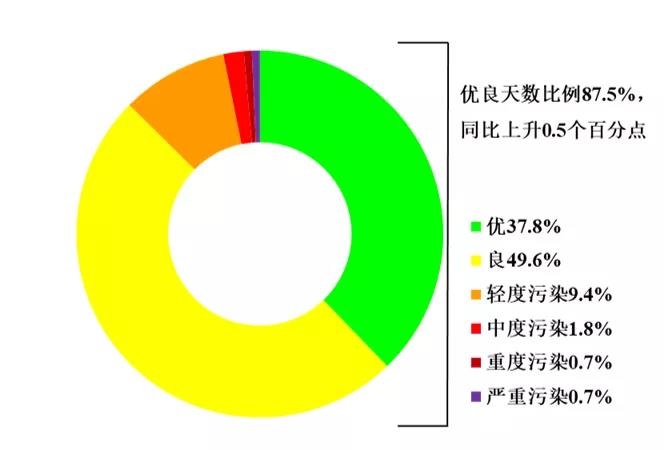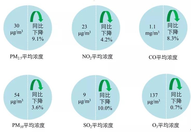 1-12月,全国339个地级及以上城市平均优良天数比例为87.5%,同比上升0.5个百分点;PM2.5平均浓度为30微克/立方米,同比下降9.1%;PM10平均浓度为54微克/立方米,同比下降3.6%;O3平均浓度为137微克/立方米,同比下降0.7%;SO2平均浓度为9微克/立方米,同比下降10.0%;NO2平均浓度为23微克/立方米,同比下降4.2%;CO平均浓度为1.1毫克/立方米,同比下降8.3%。