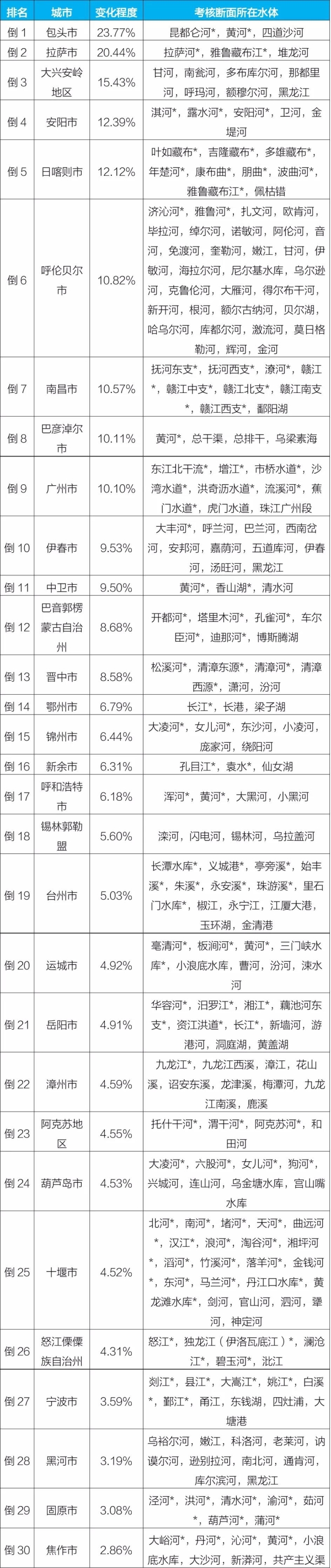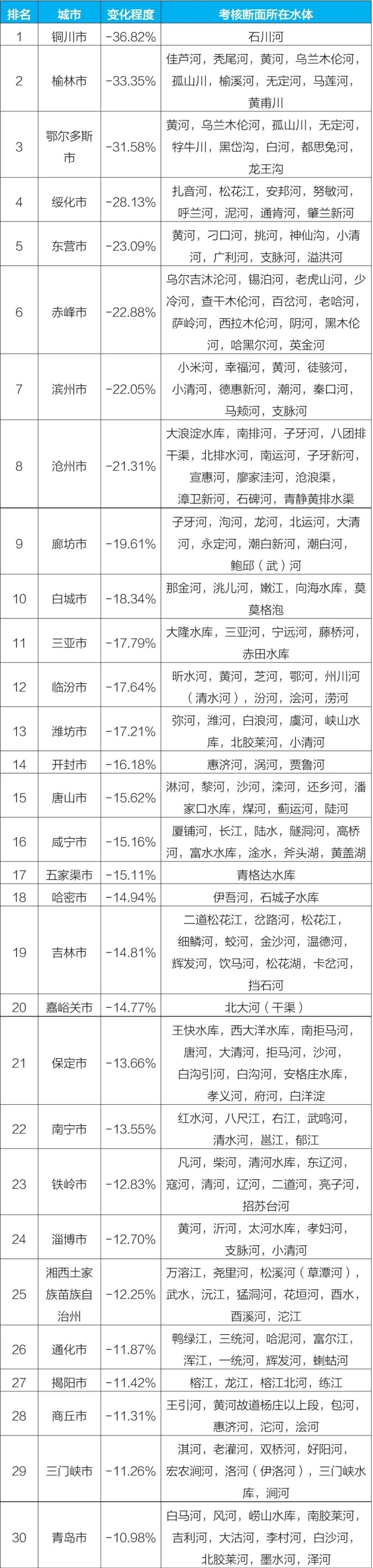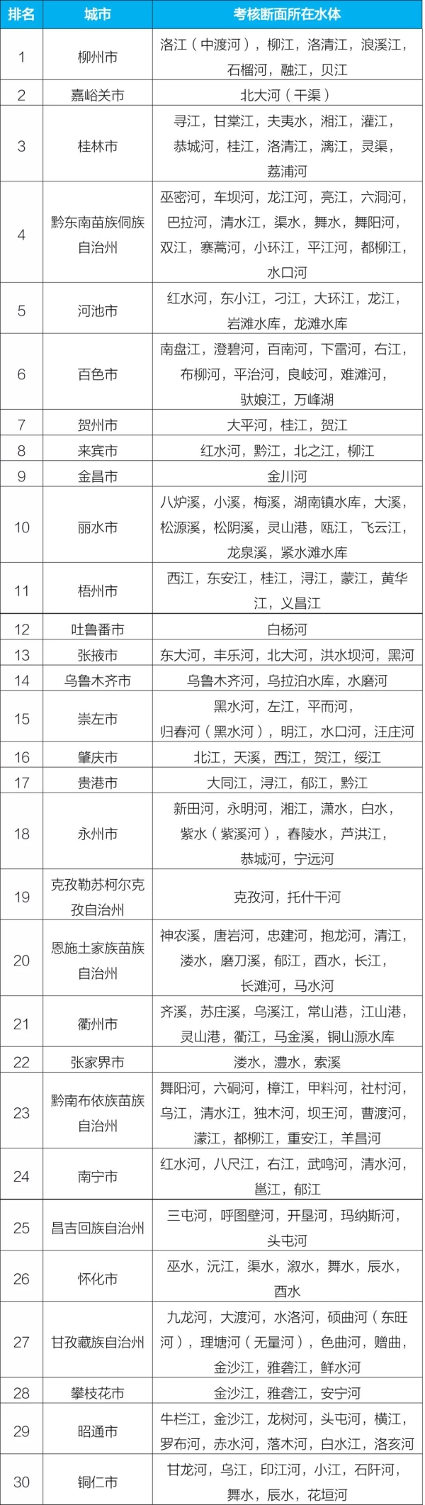 1-12月,全国地级及以上城市中,柳州、嘉峪关和桂林等30个城市国家地表水考核断面水环境质量相对较好(从第1名至第30名),临汾、吕梁和商丘等30个城市国家地表水考核断面水环境质量相对较差(从倒数第1名至倒数第30名);铜川、榆林和鄂尔多斯等30个城市国家地表水考核断面水环境质量变化情况相对较好(从第1名至第30名),包头、拉萨和大兴安岭等30个城市国家地表水考核断面水环境质量变化情况相对较差(从倒数第1名至倒数第30名)。见附表1~附表4。
