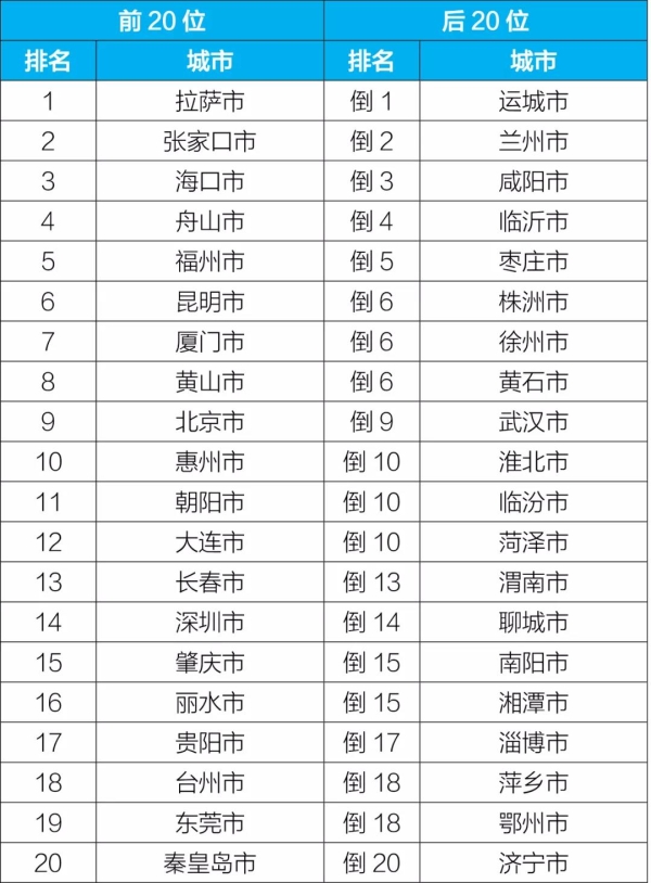 12月,168个重点城市中,拉萨、张家口和海口等20个城市空气质量相对较好(从第1名至第20名);运城、兰州和咸阳市等20个城市空气质量相对较差(从倒数第1名至倒数第20名),见附表5。