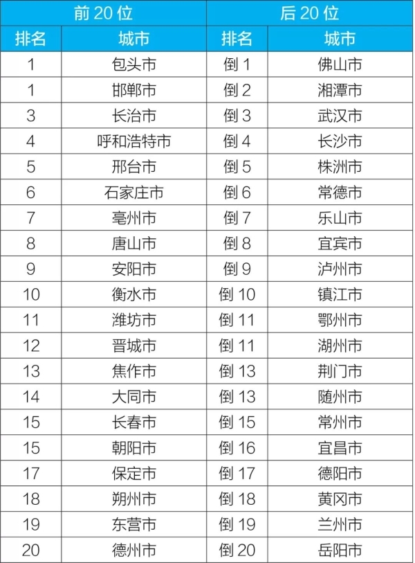 1-12月,168个重点城市中,海口、拉萨和黄山市等20个城市空气质量相对较好(从第1名至第20名);临汾、太原和鹤壁市等城市空气质量相对较差(从倒数第1名至并列倒数第20名),见附表6。包头、邯郸和长治市等城市空气质量变化情况相对较好(从第1名至第20名);佛山、湘潭和武汉等20个城市空气质量变化情况相对较差(从倒数第1名至倒数第20名),见附表7。