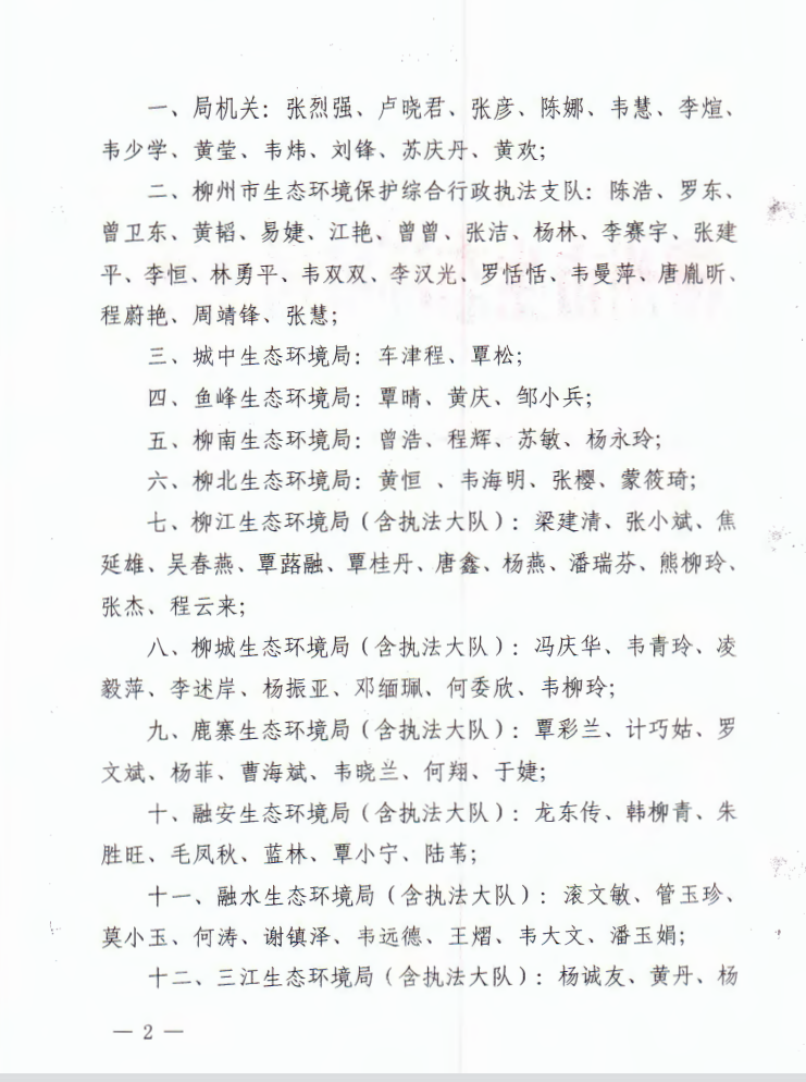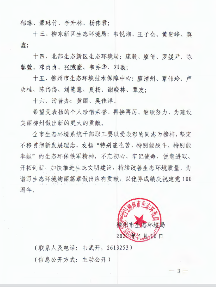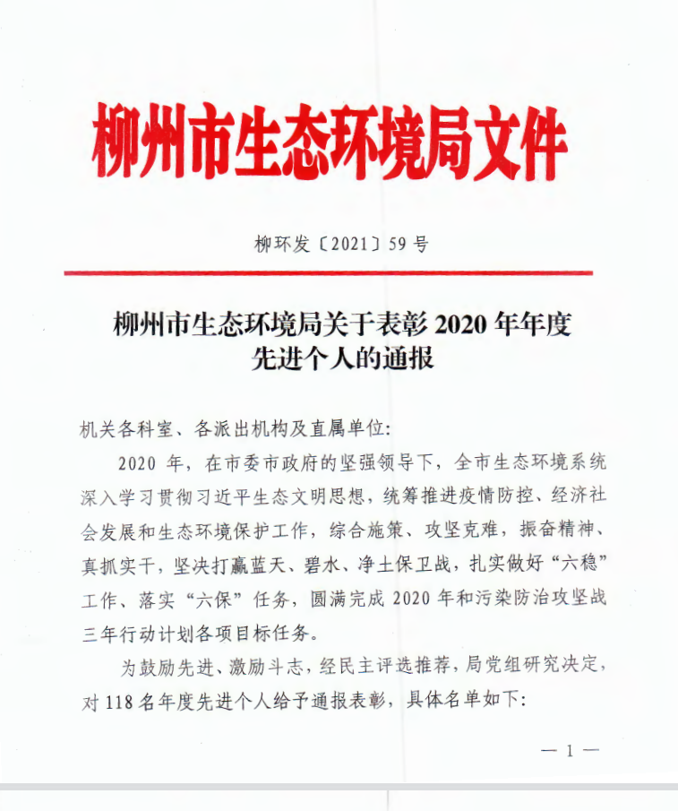 柳环发〔2021〕59号 柳州市生态环境局关于表彰2020年年度先进个人的通报