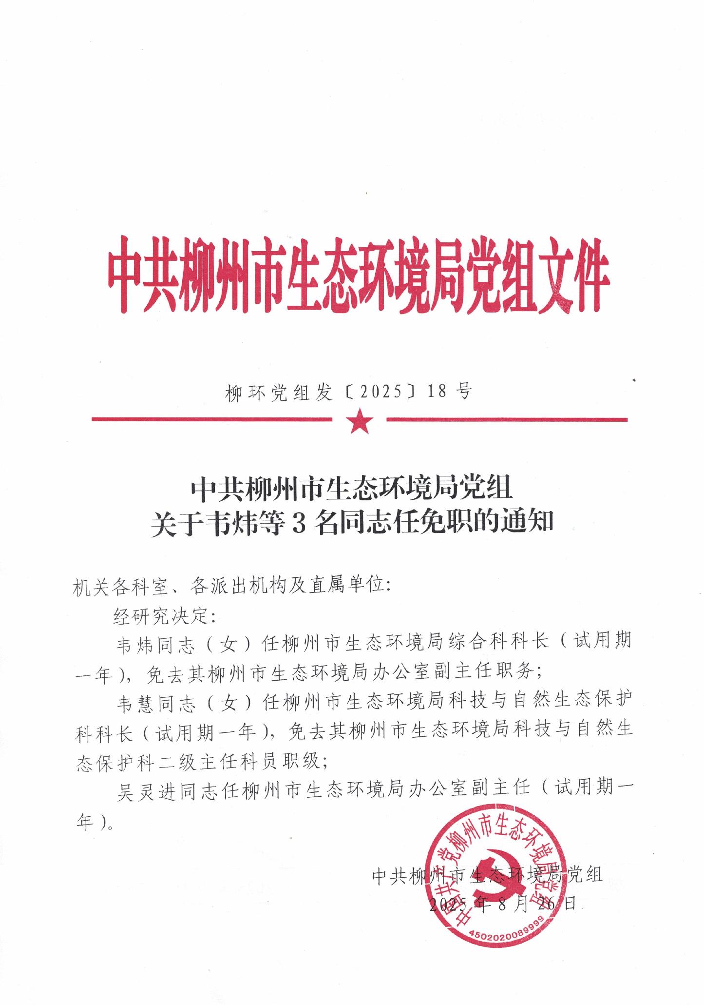 柳环党组发〔2025〕18 号 中共柳州市生态环境局党组关于韦炜等3名同志任免职的通知