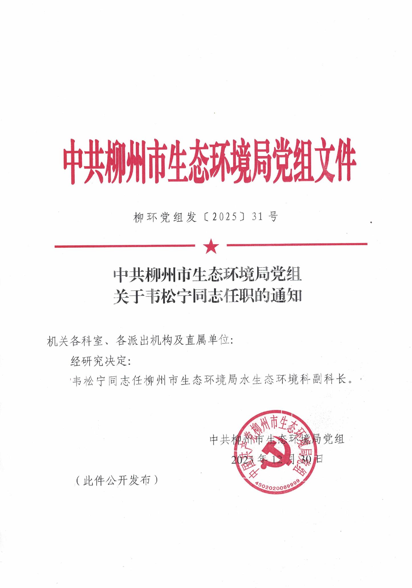 柳环党组发〔2025〕31号 中共柳州市生态环境局党组关于韦松宁同志任免职的通知