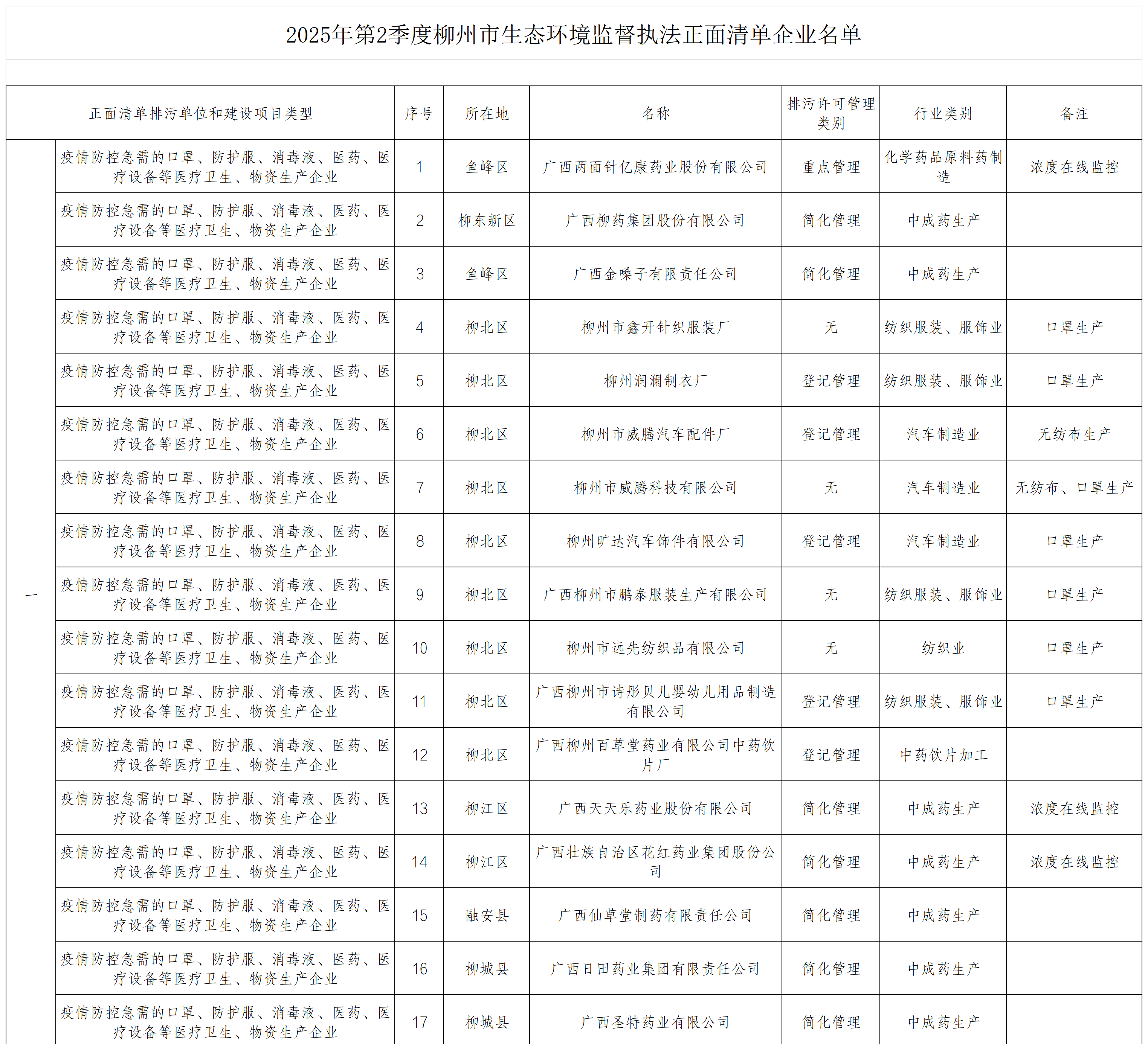 2025年第2季度柳州市生态环境监督执法正面清单企业名单