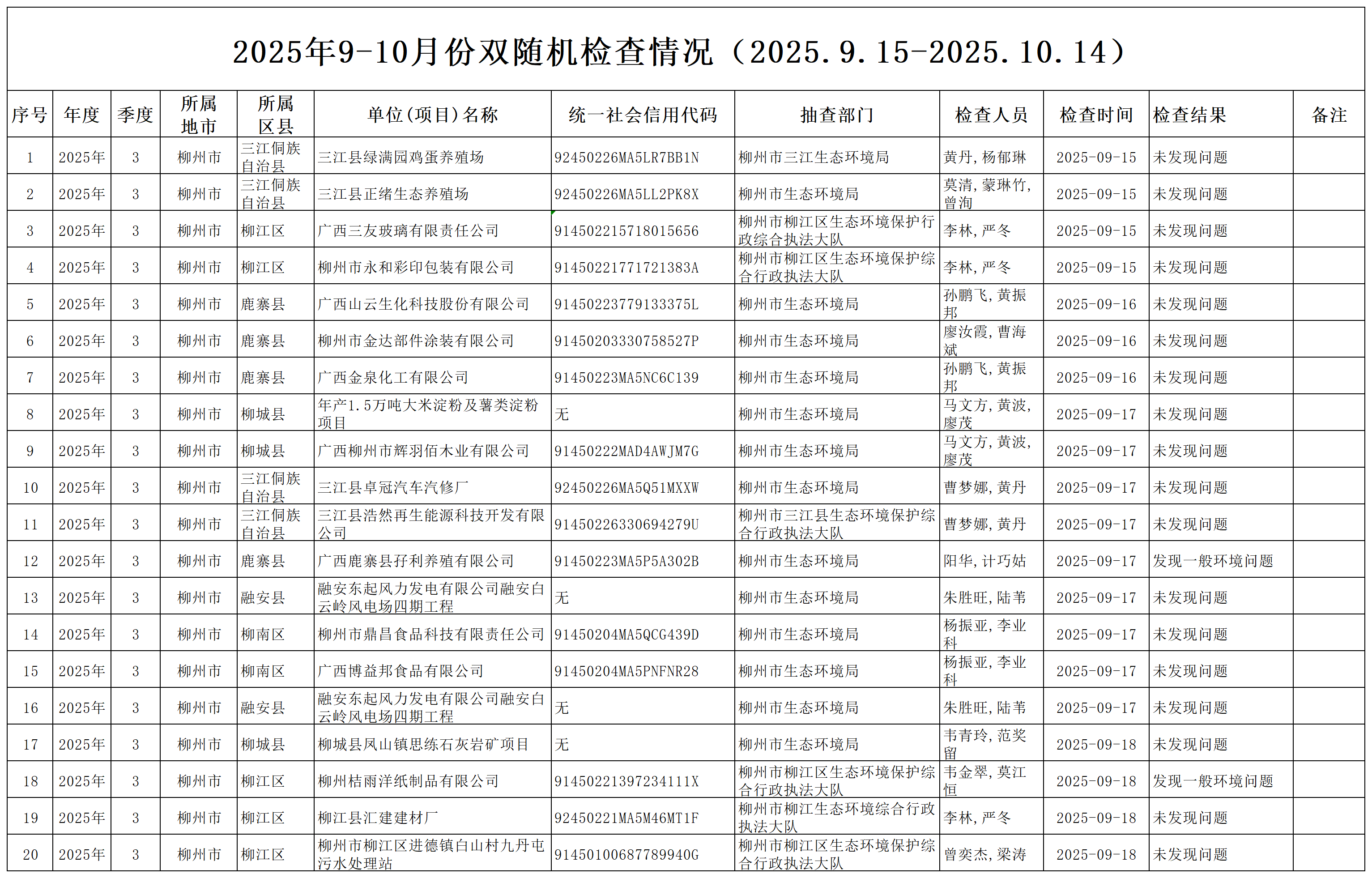 2025年9-10月份双随机检查情况(2025.9.15-2025.10.14)